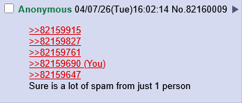 >>82159915>>82159827>>82159761>>82159690>>82159647Sure is a lot of spam from just 1 person