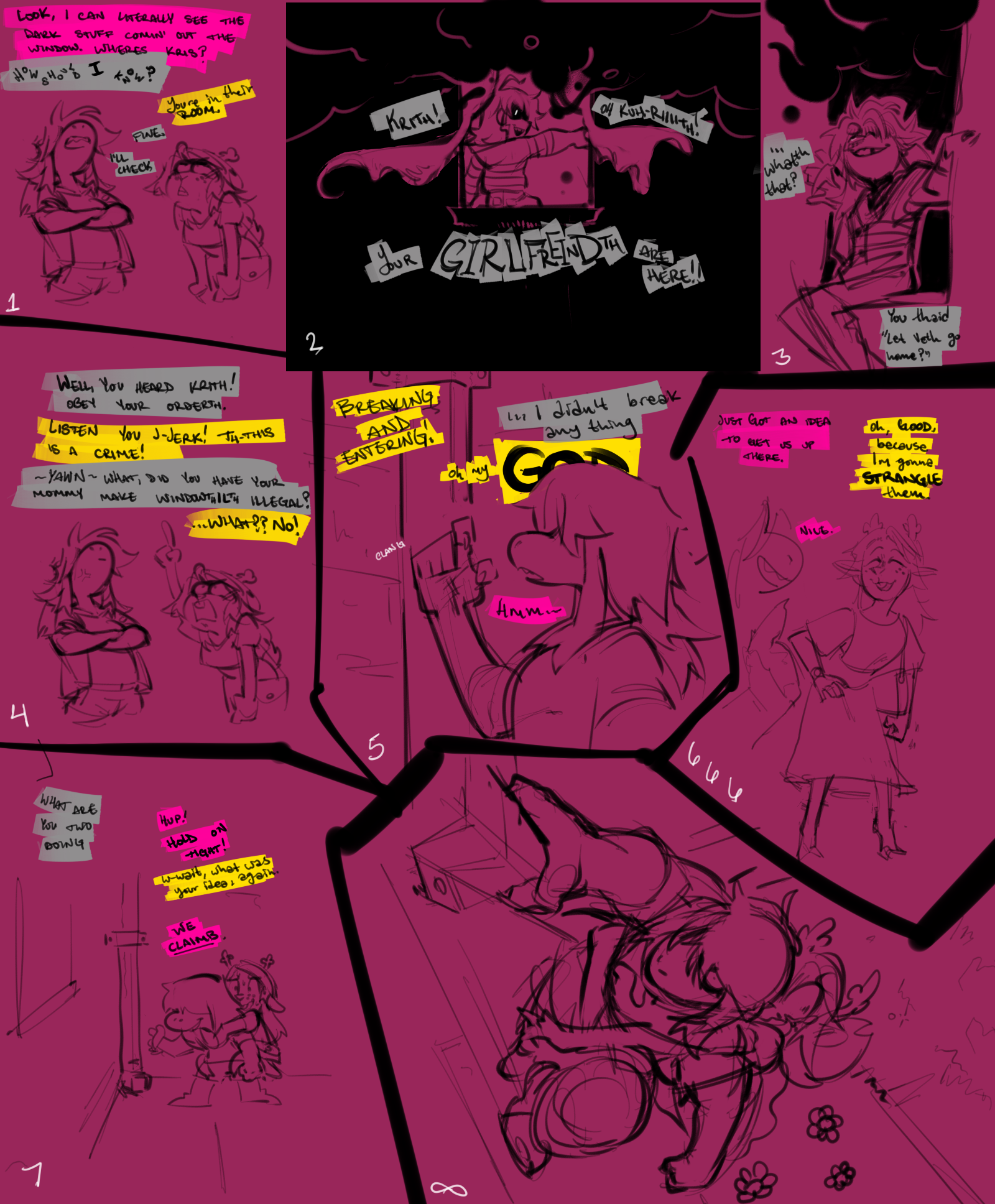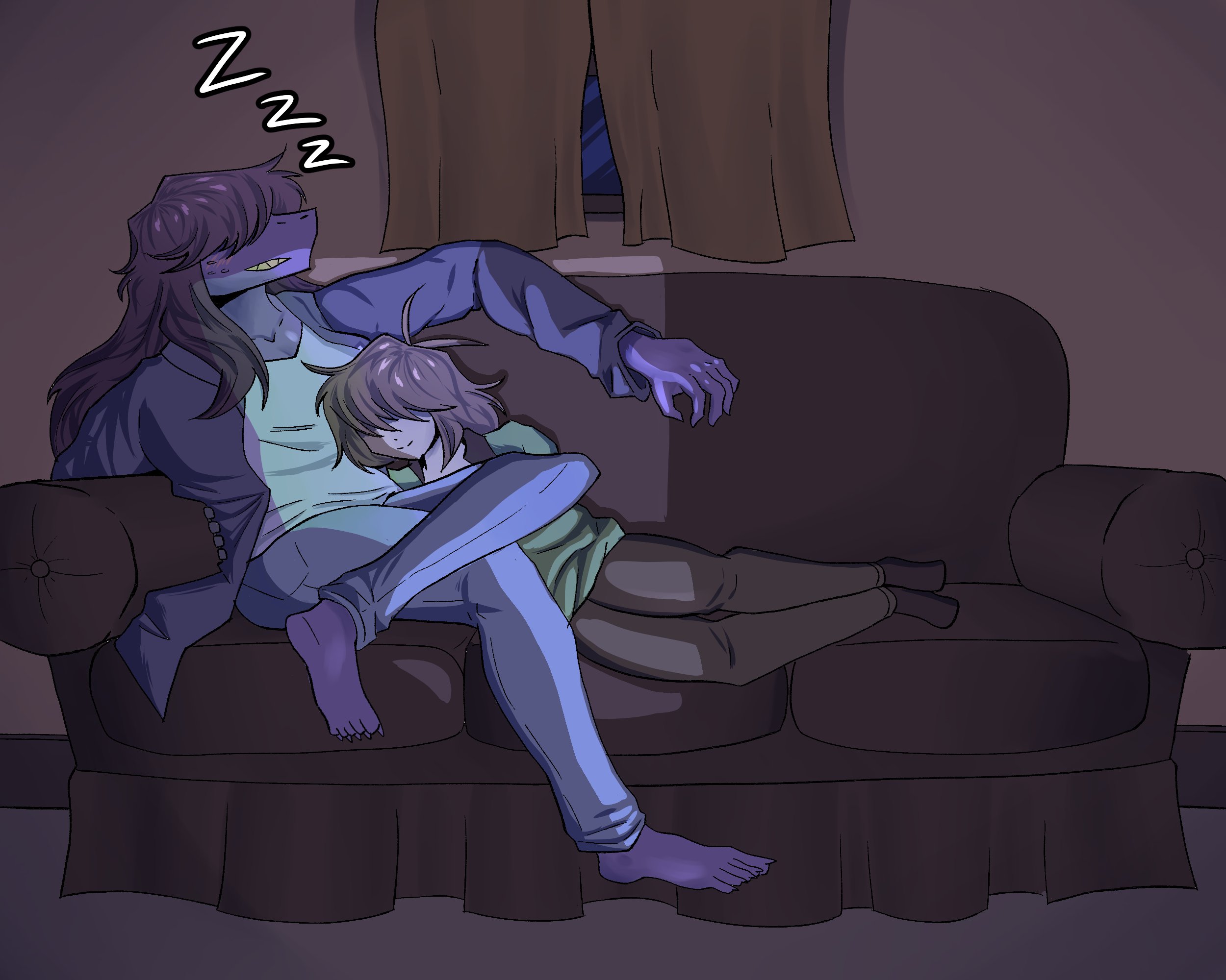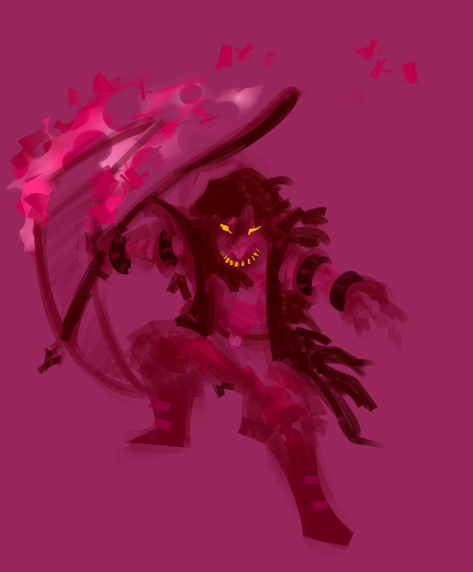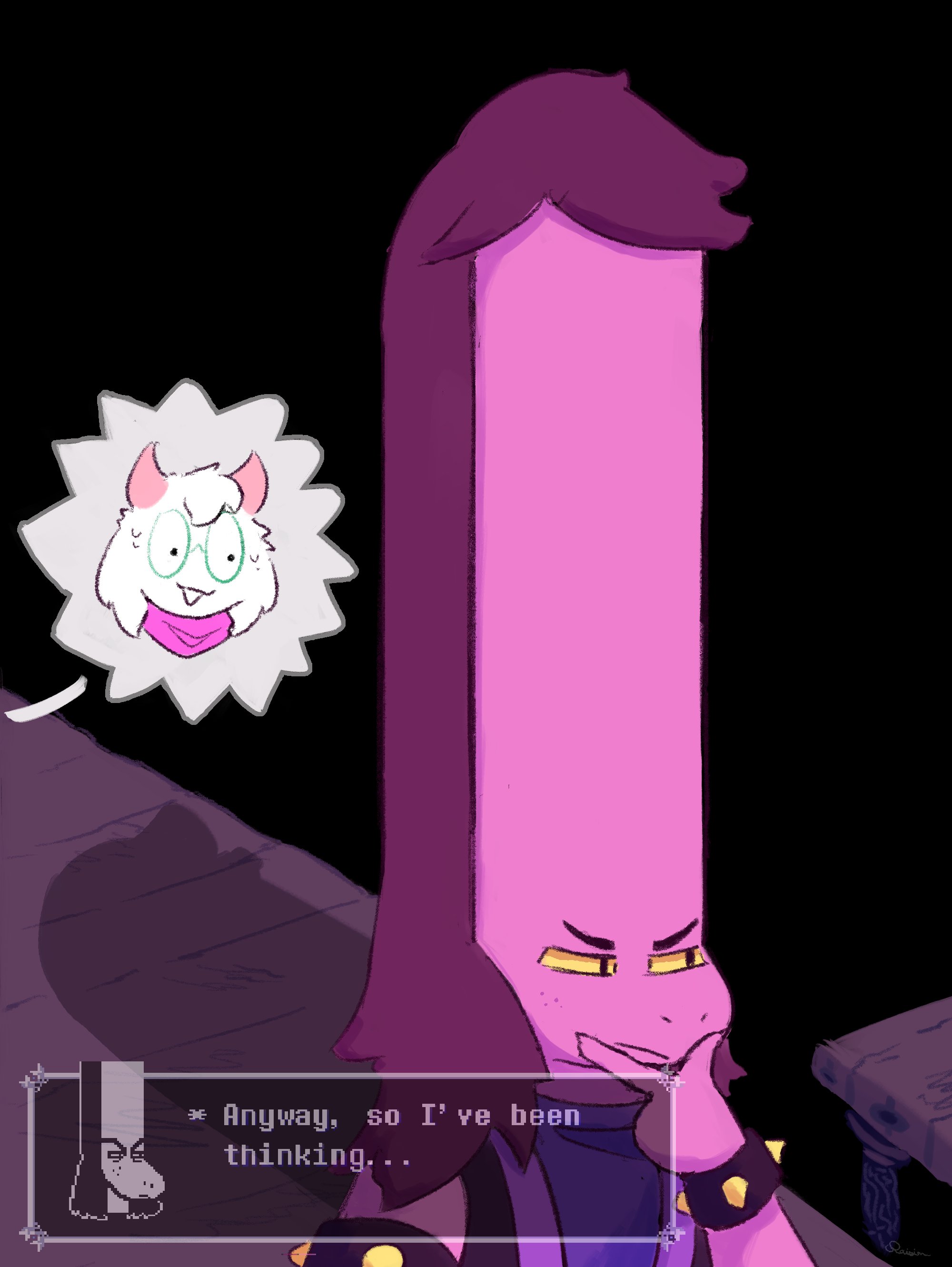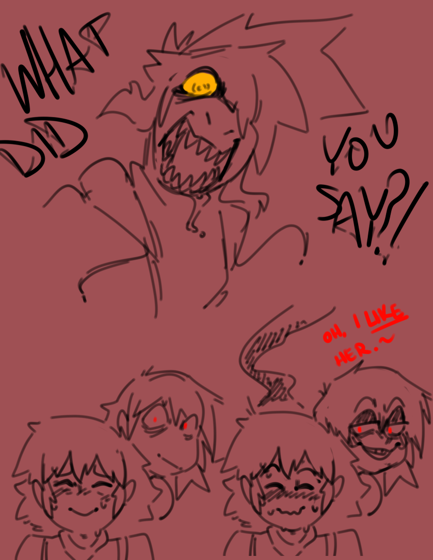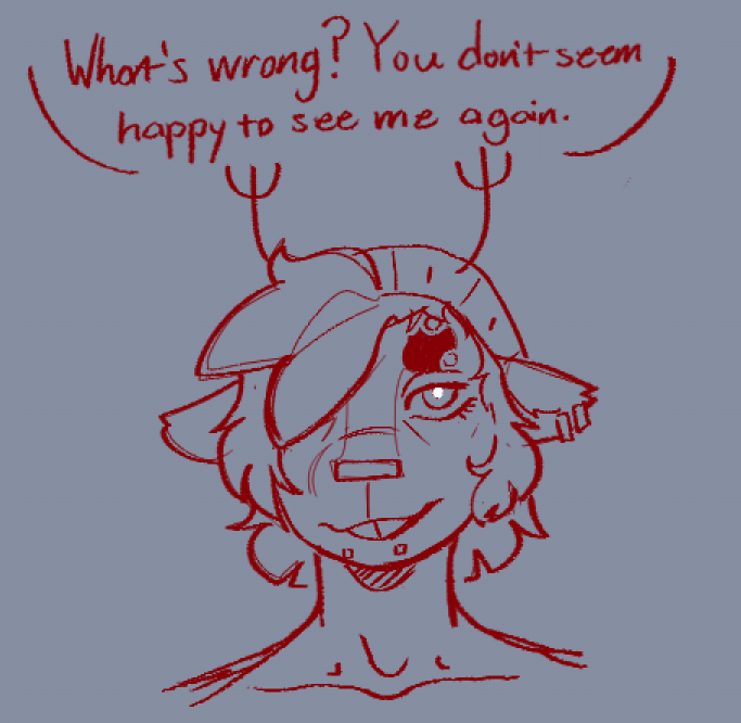 I always picture Veth as like, Dr. Nefarious whenever she's being goofy and truly enjoying herself as being the antagonist of the story. Part of her just *knows* the gang will never seriously do anything to her after a while, so she can be very loose and creative with how she tests them. At most she gets a bit of momentary rage whenever she fails, but failure is just another avenue for learning, innovating, and finding a new way to torment the gang another day.Conversely, the only thing that can make her become scared and apprehensive is if that flow stops. She'd never openly admit it, but in a way she does care about the feelings of her foes. She still wants to... win, and everything, but she'd be a magnanimous victor. If Kris ever locks in, if Susie ever gives her that glare, if Noelle ever looks past her with that thousand-yard stare... it unsettles her in a deep way, reminds her of the feeling of being consumed by the void when she was discarded. She clings to the warmth of her new life fiercely, even if she'd never acknowledge it.If she loses that, and is being more serious and goal-orientated, she loses a lot of the joy in it and becomes more methodical, down-beaten, and depressive. The isolation bears down on her and dulls her mind, to the point where she gets blanks in her memory where she seemingly just goes on autopilot doing things that she is meant to do. She stops taking care of herself, stops talking to people, starts having thoughts that aren't her own.
