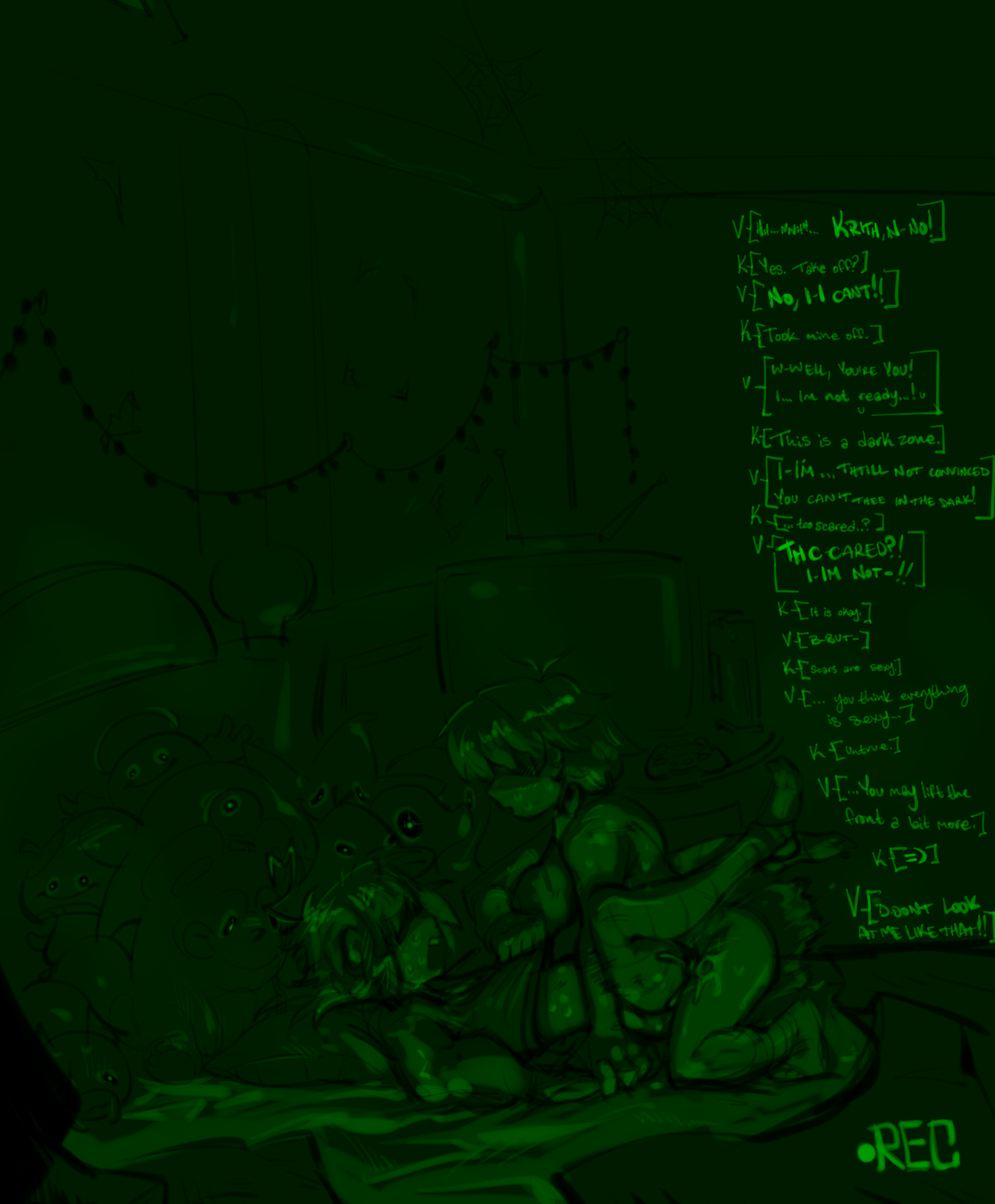 >>82189718nta but I don't see how.Veth's presence doesn't preclude Kris' character traits, or anyone else's for that matter.Hell, half the reason we like her is how she bounces off them like what we see in >>82183292: Noelle is nervous and distant by Veth's creepiness, then annoyed and powerless against her ragebaiting. Susie's a tower of strength who stonewalls Veth's attempts at manipulation. Kris (as we see in other pics) is befuddled by another human shaped thing in his life and is trapped between wanting to safeguard his happy ending, and trying to save someone who, like he once was, is willing to throw themselves in the meatgrinder for some forlorn purpose. And all that's outside of smut.Like >>82189752 said, a good OC brings out the canon characters' personalities as we know them, and Veth does that very well.
