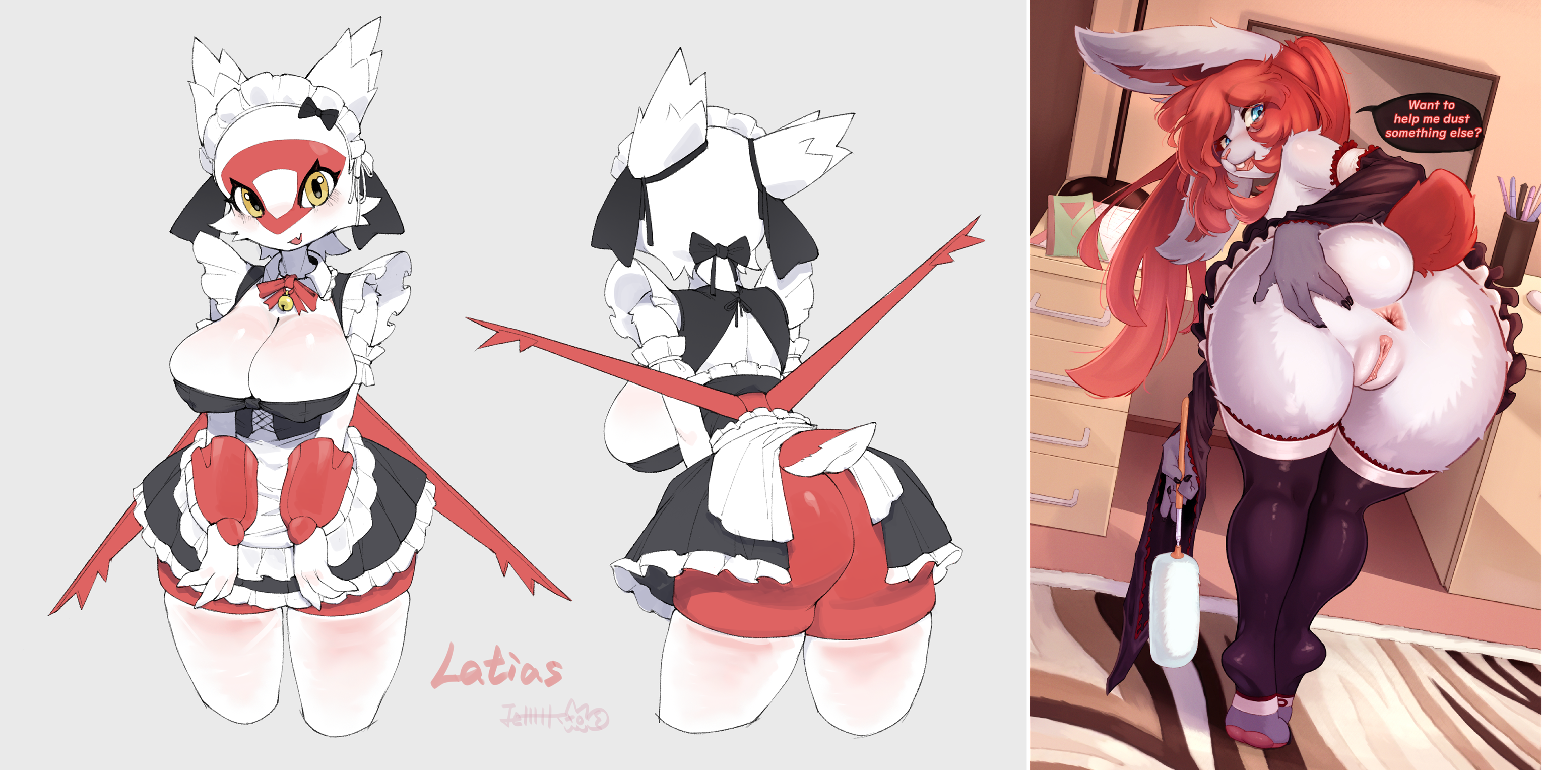 Requesting maid Latias presenting her spread ass to the viewer, saying, "Here's the cake you requested for!"Optionally, to have an expression cutaway of Latios looking surprised.