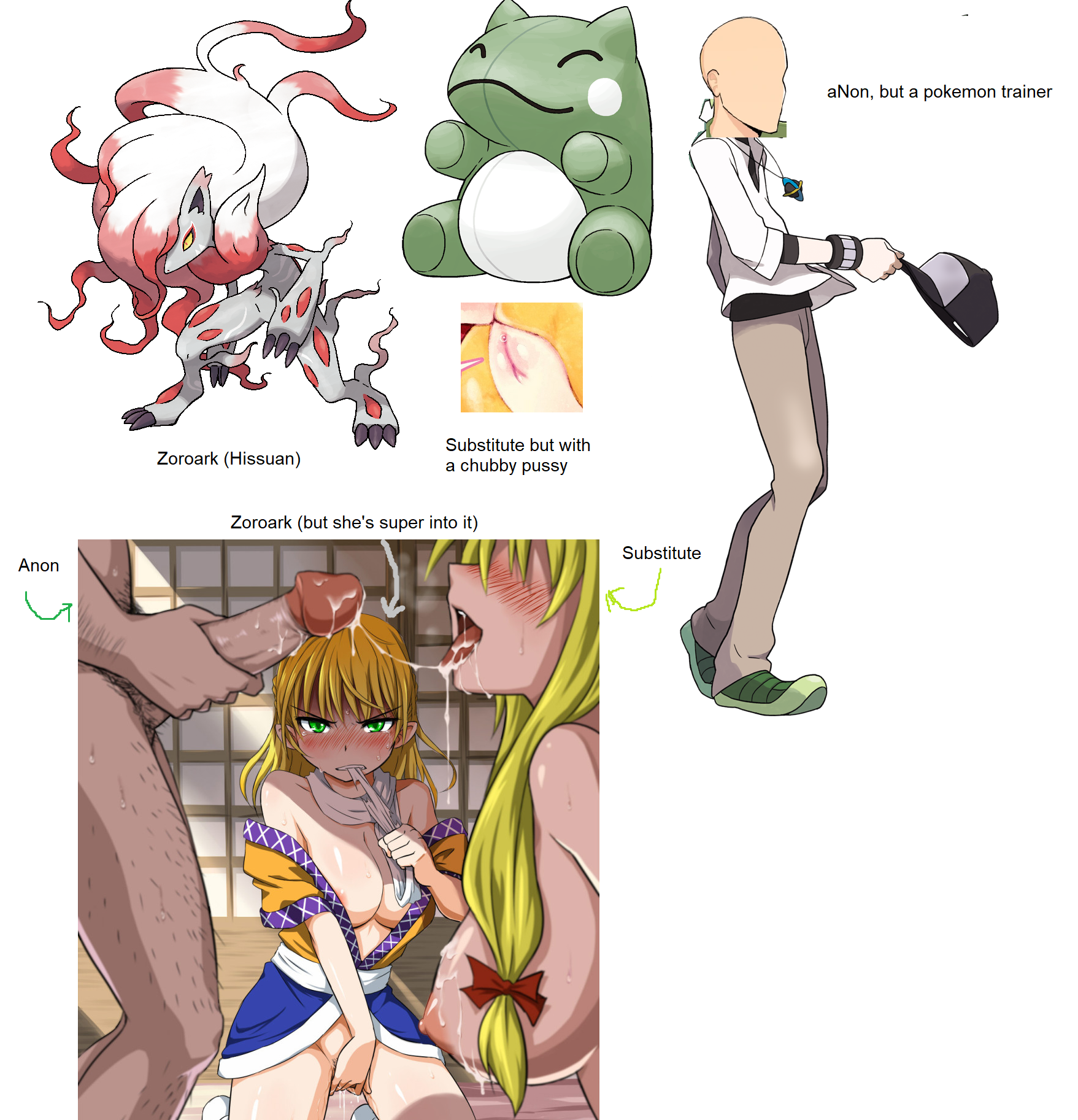 >>82173236Requesting Anon(trainer) fucking a Substitute Doll with a fat pussy, while the Zoroark who made it fingers herself in the background. Kind of posed like the example, where you see him pulling out.
