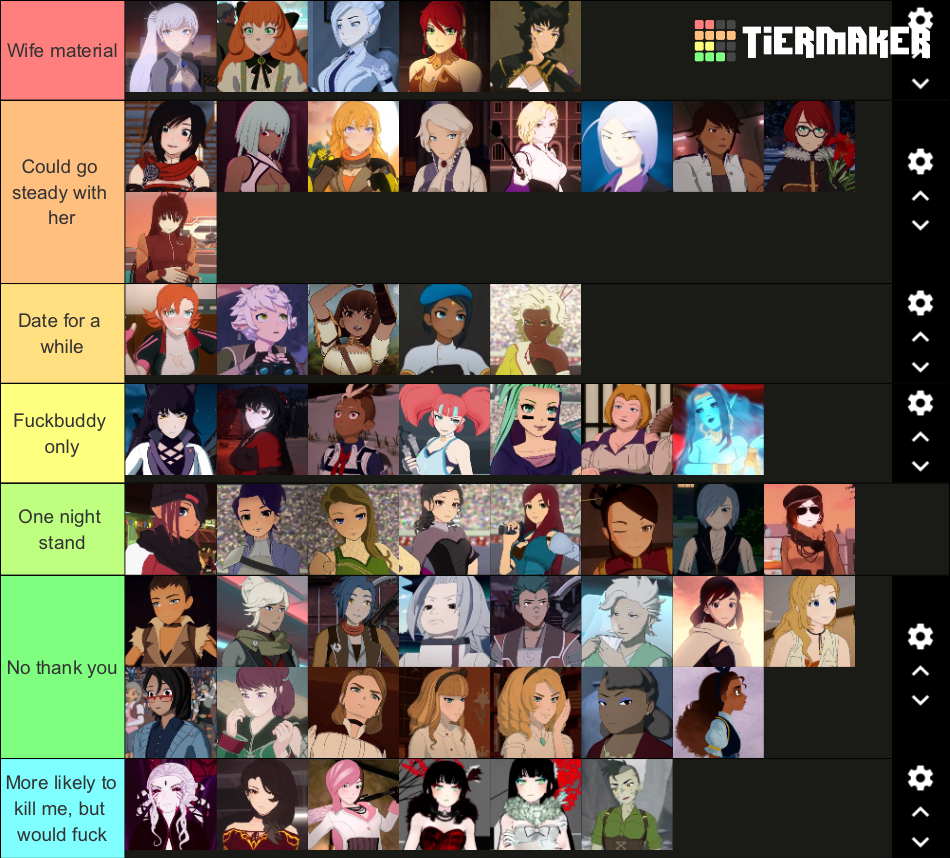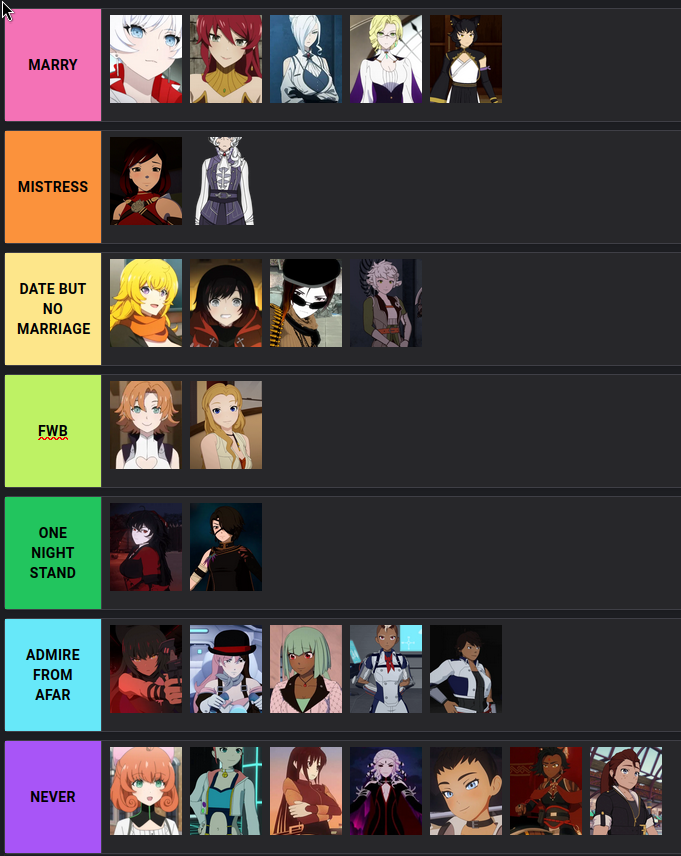 >>82215846Winter is the only marriageable one. Kali and Glynda would probably make good girlfriends though but I don't see it working out unless you were a widower or a work-shackled wagie respectively.