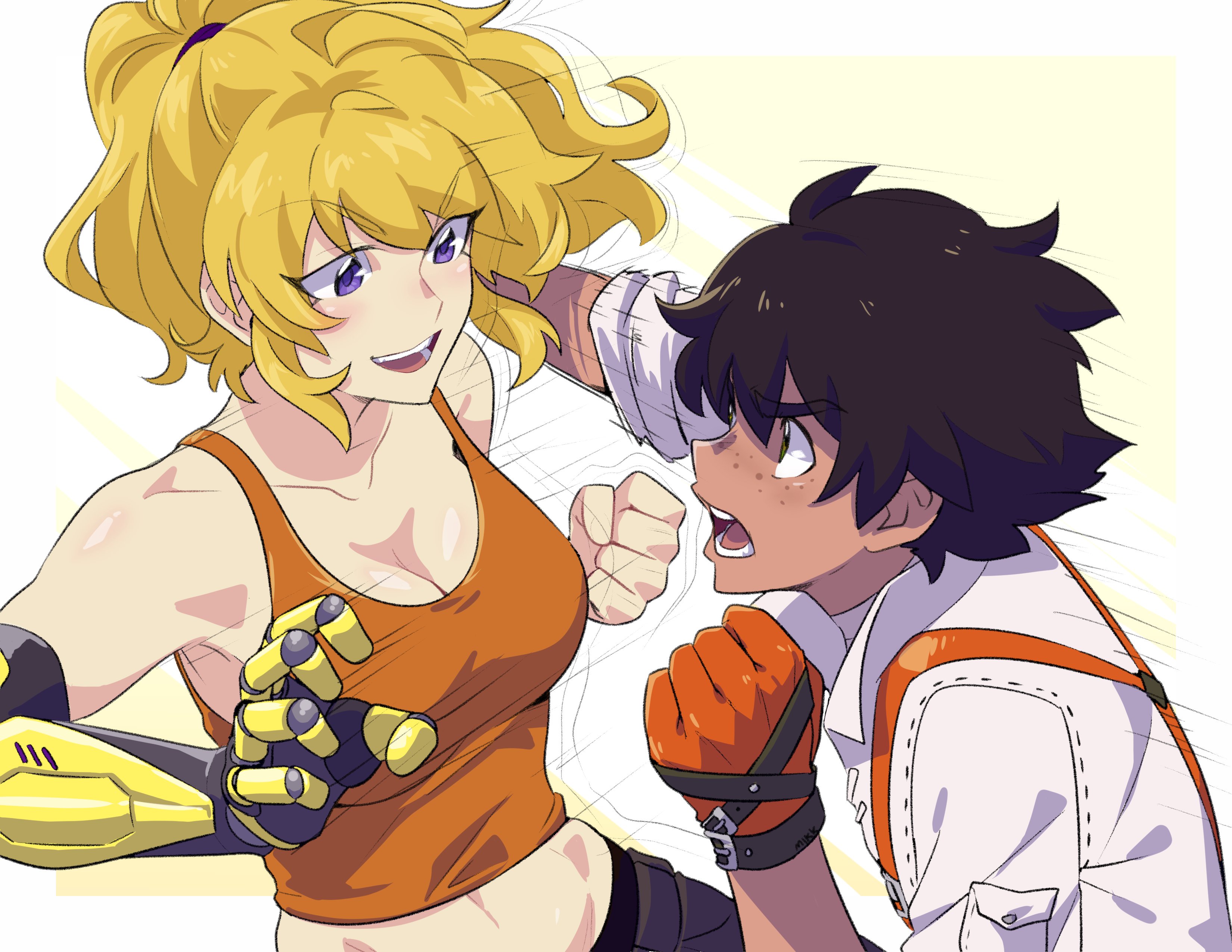 >>82242179>Yang pulls down Nora's top and bra>before Yang can react Nora turns around and does the same with her>as Yang freezes and blushes Nora runs away across the academy topless and flaunting Yang's ripped top