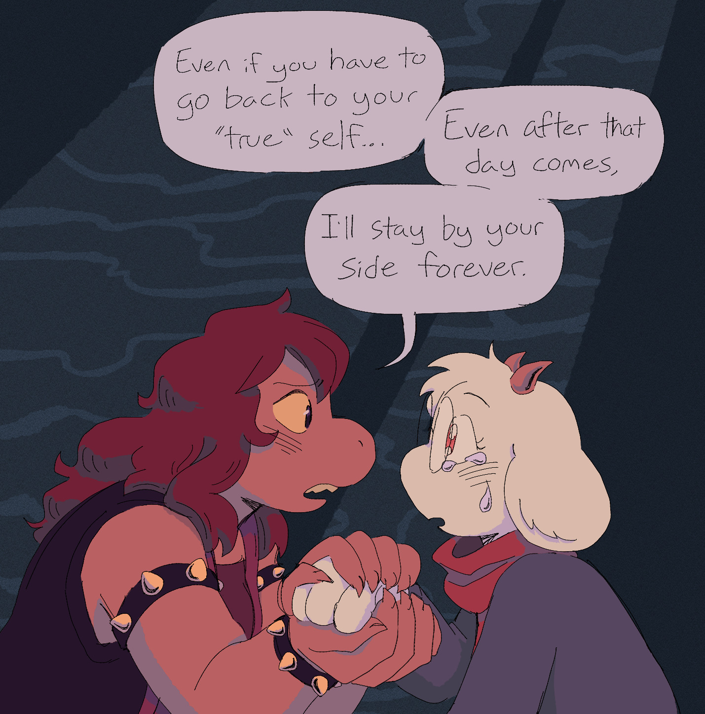 >>82269006Susie would definitely confess that kind of thing to Ralsei - being upset that she moved from town to town, never forming genuine bonds until this moment. How it makes her feel like she wasted her entire life until now. Ralsei would just reassure her that he loves the Susie he knows and that Susie and him might've never even met, and even if the path was hard to get here, having her friends now still means something.Both of them have a lot of identity and self-worth issues over having a very isolated youth which I think they do a lot of bonding over off-screen in ch 2. While Kris is nice to be around, I like to think Ralsei is Susie's emotional hotline.