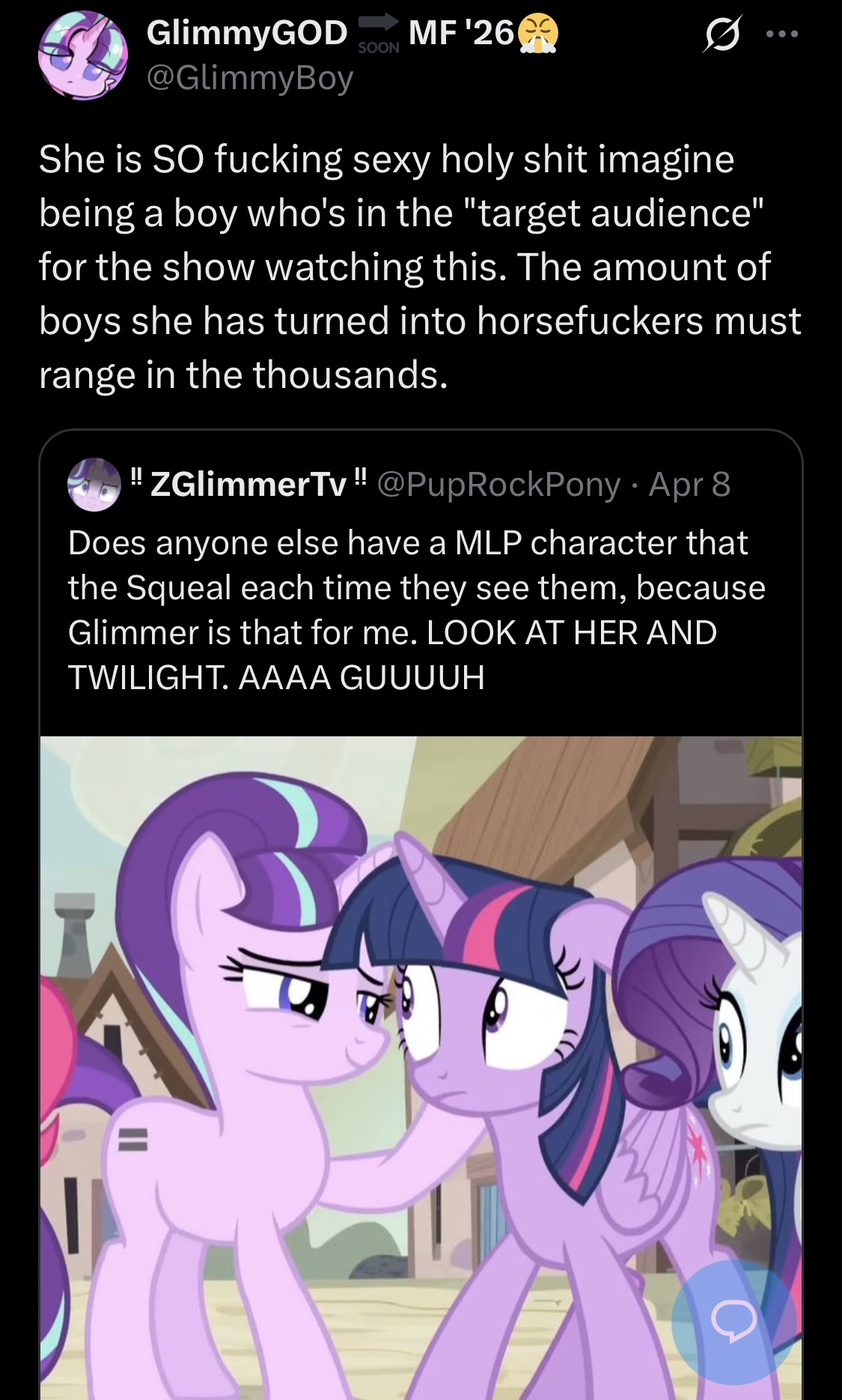 >>82269877Both main line and EQG are still pulling their weight after 15 years of FIM's existence to the point there's a non-zero amount of people who goon to the show more often than the porn