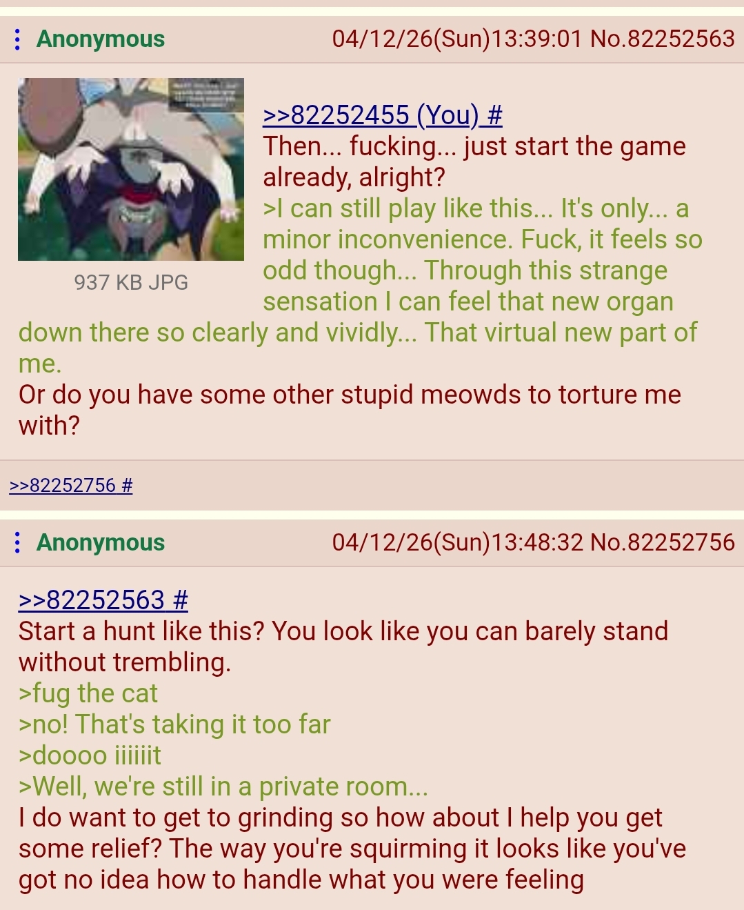 >>82256608A mix up? The way they're all acting, I'm starting to think they did this on purpose. Just "hey anon, we got the stuff, drink this" and a mystery flask. To be fair, not the first mystery drug we've gotten hooked up with. It's not like there's as big a performance difference between male and female surprisingly enough. I'm lighter like this so it's less handicap we have to deal with including an anthro. But if I knew they were gonna girl me, I'd never have agreed
