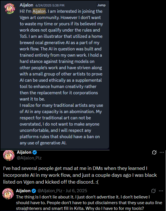 >i'm gonna prove artists can use ai ethically and i dont care who gets mad>they were all mean to me and blacklisted me i shouldnt have to tell anyone anything