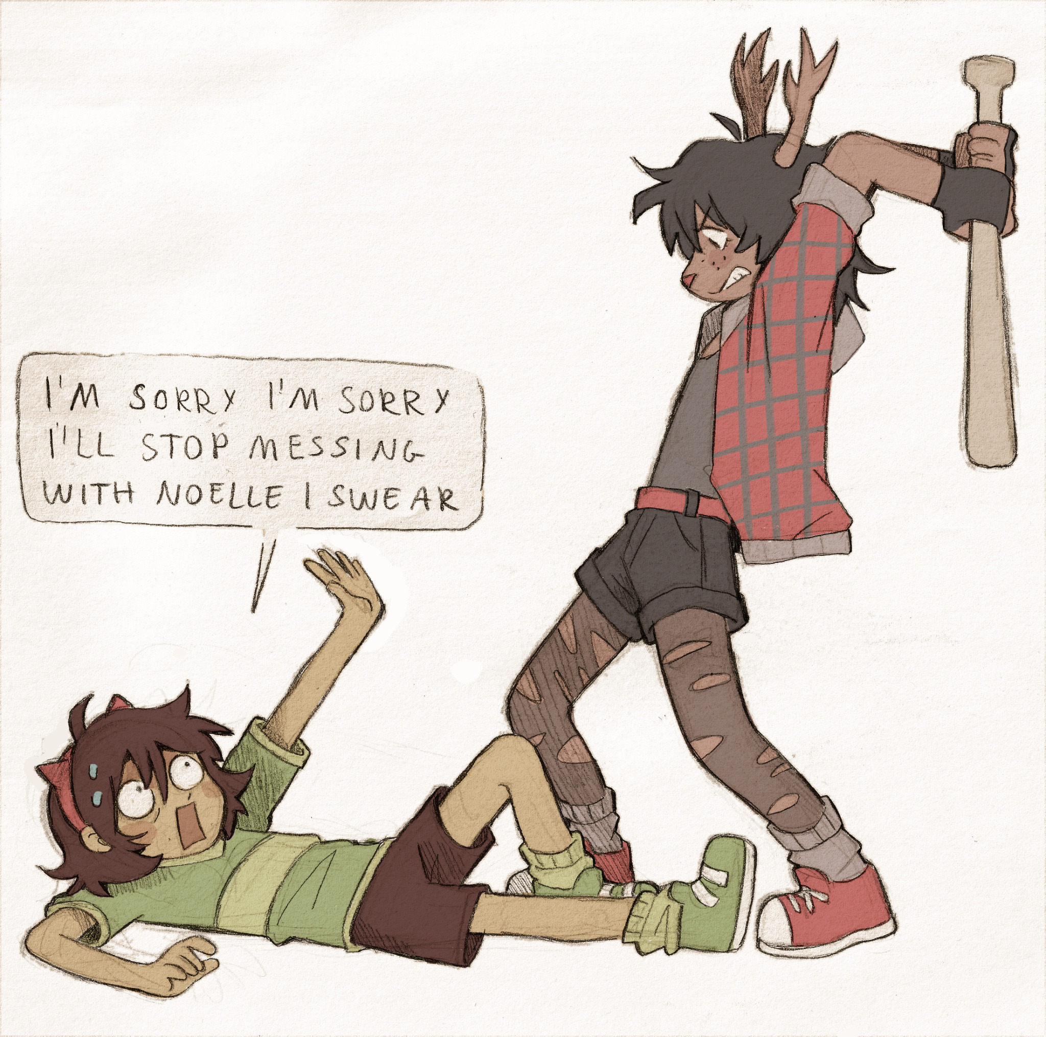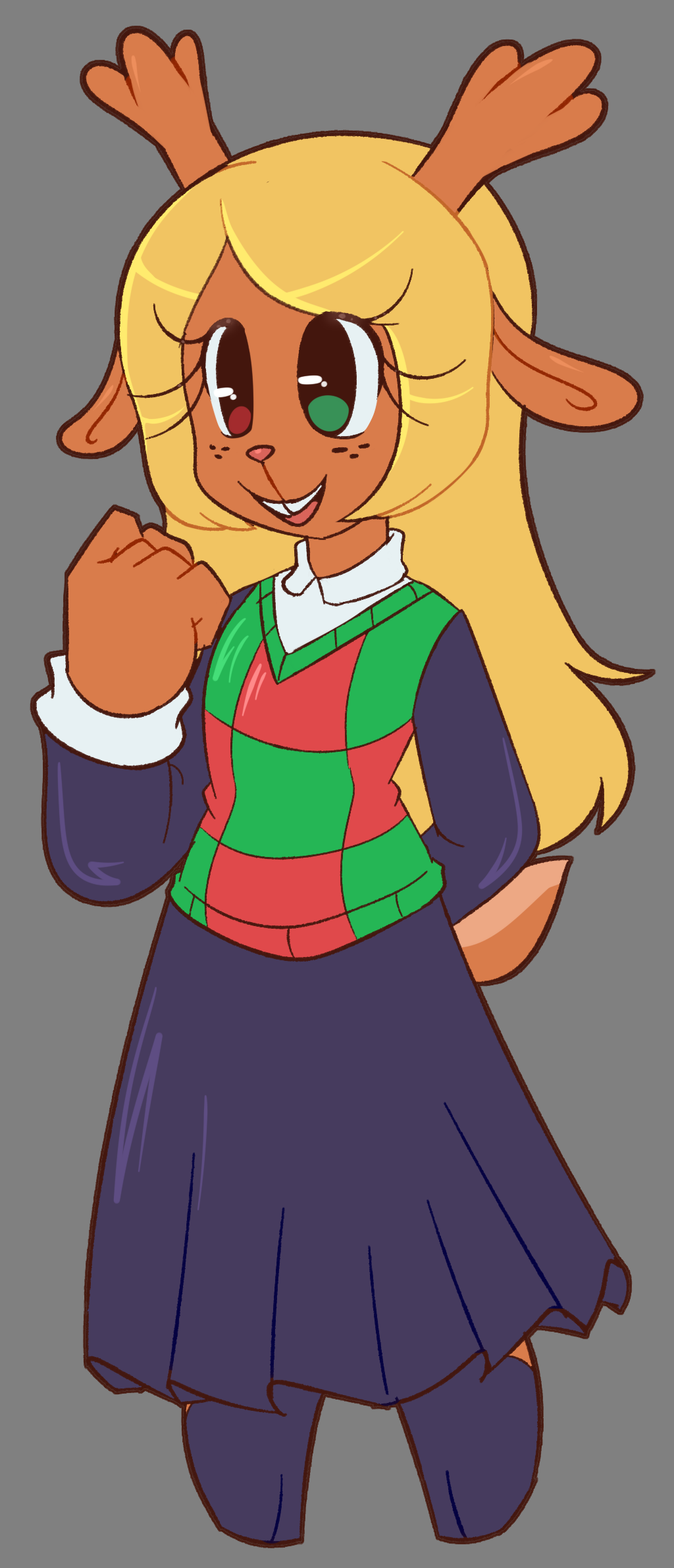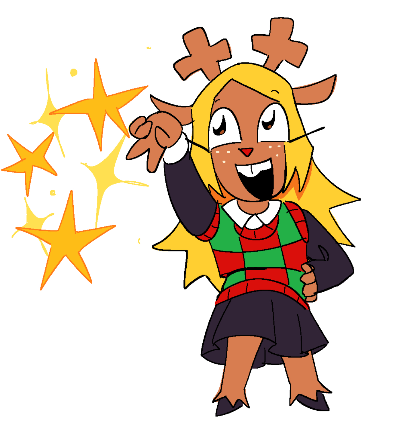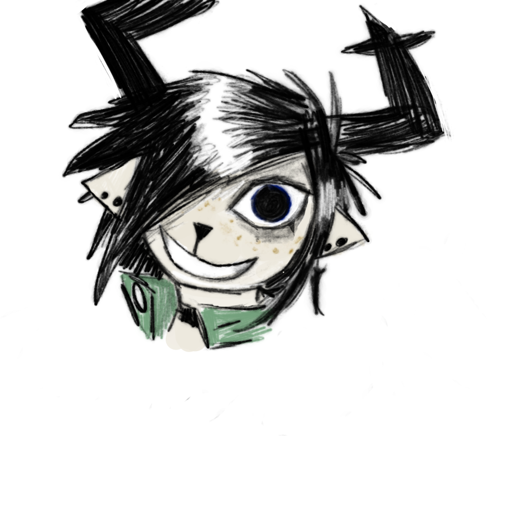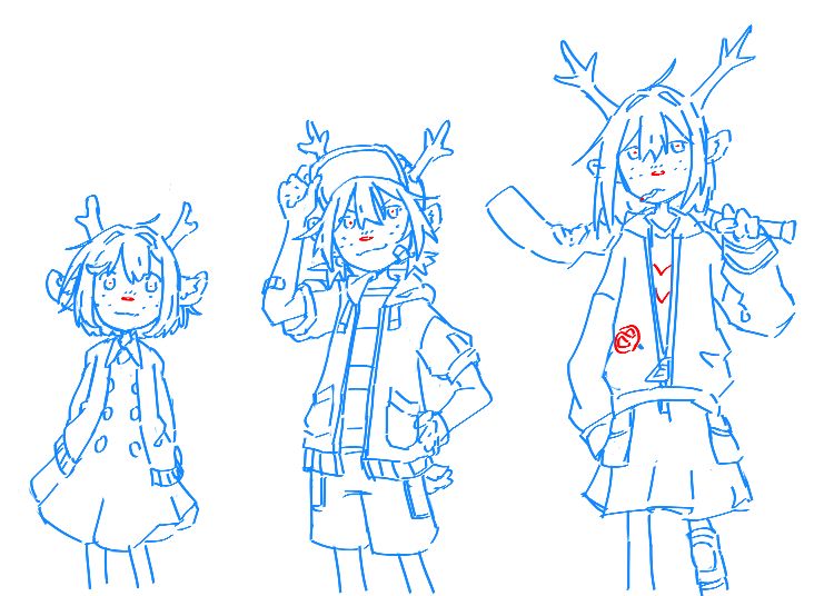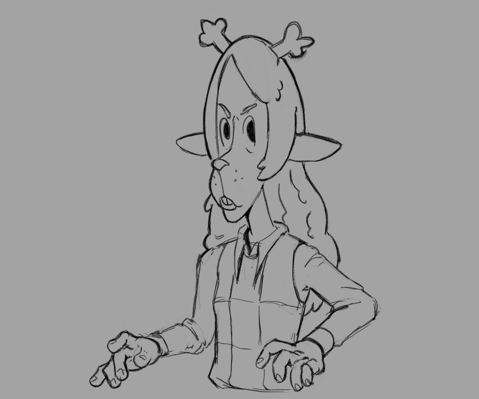 >>82292559...and the digital color version. Both her hair and antlers are black, her jacket is of a drab green with a sleeveless black undershirt. As for the rest, I assume she is wearing denim shorts with rolled leg cuffs and what appears to be highly-customized Chuck Taylors; indicated by the round brand seal on the "heel." I don't think he ever indicated a color scheme below the waist, so that's all conjectural on my part.