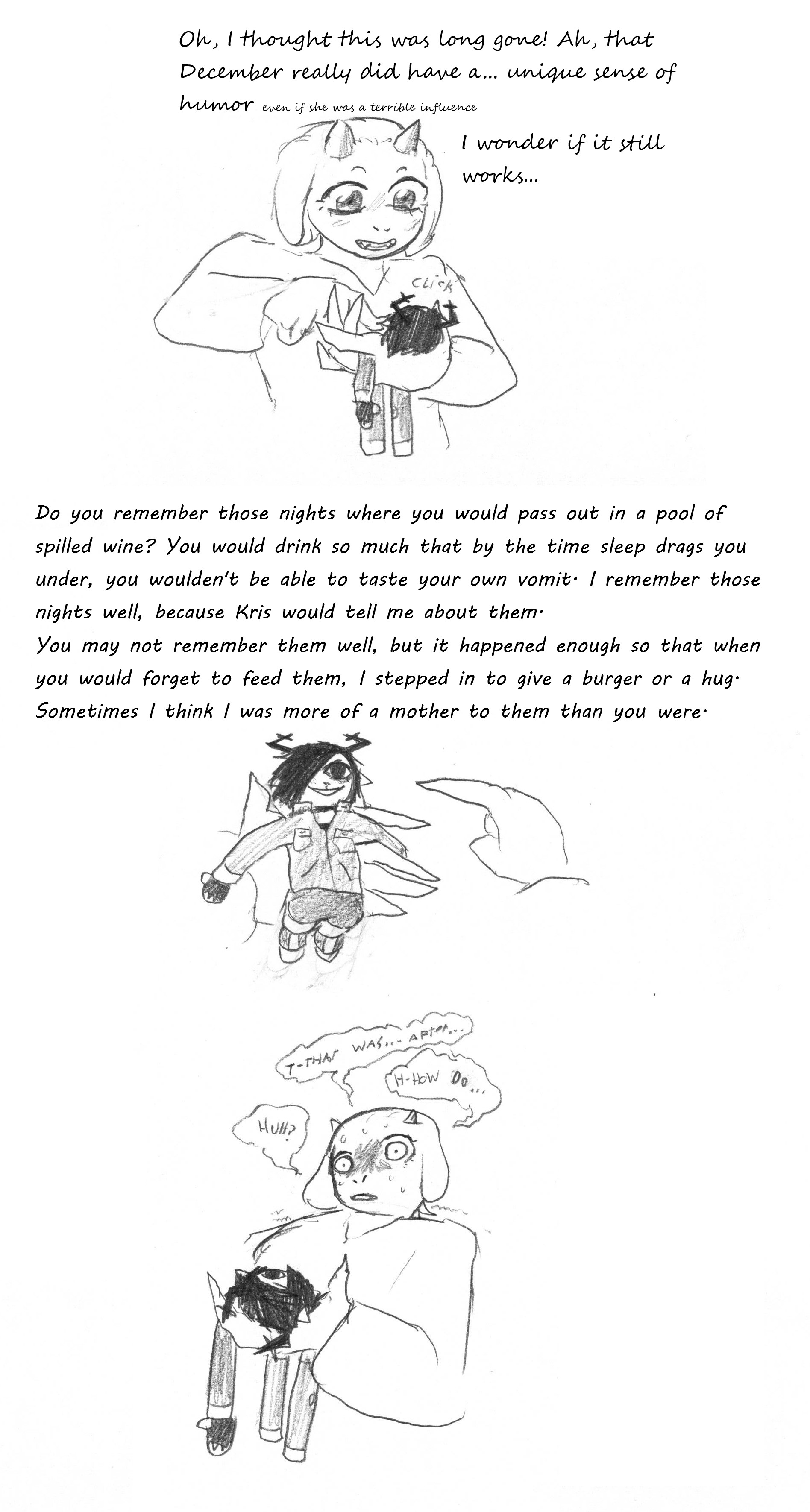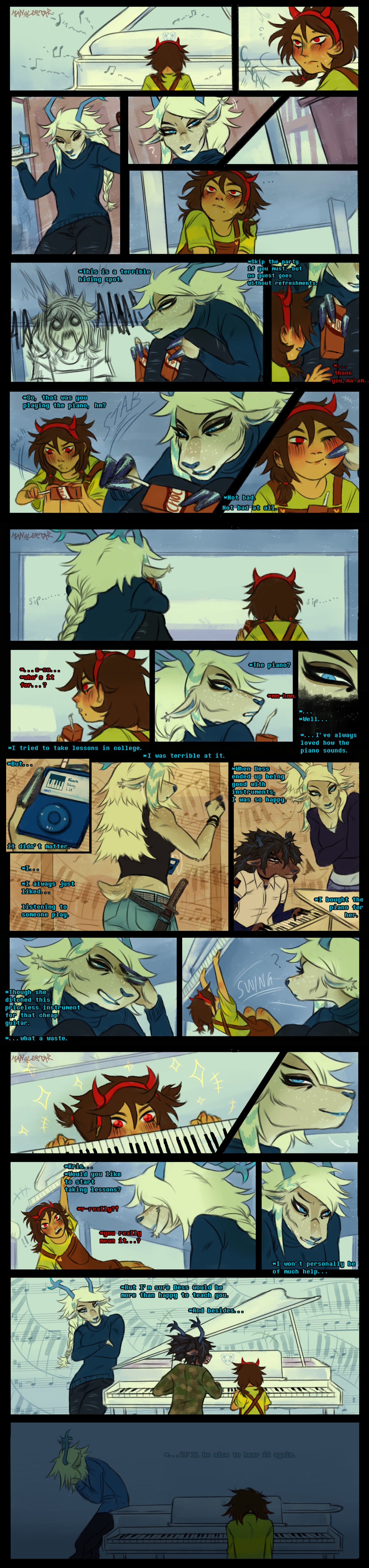 >>82307970>"I could never sleep right. Not after that night I heard him playing on the family piano.">"It made me feel so ashamed. All of that money blown trying to teach me, and when I got angry, I'd just slam the cover shut and run to my room.">"I couldn't play anything when I was little, but at least I have my guitar.">"But then one day, Kris got all weird and flaked out right in the middle of a board game with Azzy and us.">"It was the nicest sound I had ever heard coming from that open kitchen door.">"And it kept happening.">"He wouldn't even let Elly watch.">"So why couldn't I get those ivory keys out of my head?">"Then one night, when Kris was sleeping over, he did it again.">"When I stopped feeling angry at myself and sat against the wall with my door open, I heard it...">"The keys that calmed me down.">"I never wanted to hear anything else.">"Won't you play it for us again someday?"