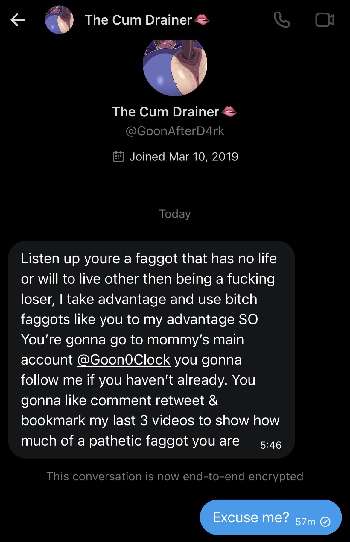>>82307255Listen up. You're a faggot that has no life or will to live other than being a fucking loser, I take advantage and use bitch faggots like you to my advantage SO You're gonna go to mommy's main account @GOON0CLOCK you gonna follow me if you haven't already. You gonna like comment retweet & bookmark my last 3 videos to show how much of a pathetic faggot you are.