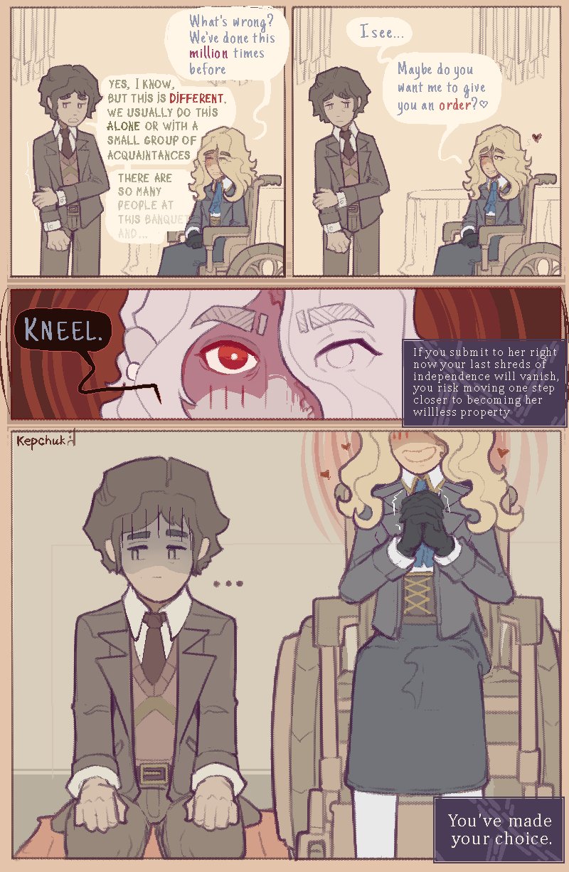 >>82336762“A-aAH-ghg…” – Jeremiah fought his voice, his own instincts and flesh bidding him to move.But they had gone ignored, why, they always went ignored when Sib was involved. A reasonable man would’ve lurched back in a panic upon sensing the air filled with the half-deadened woman’s loathsome influences, a good man ought to have left long ago.And still, he had shunned all such notions, choosing, yes, *choosing* to remain under the alabaster lady’s thrall. So it was then, in truth, he deserved everything that happened to him, he deserved the steaming beverage to again singe his poor skin, the startling crash of the porcelain against the floor and biting words of that beautiful monster he served…He had screamed at first, that sign of pain being restrained and snuffed by him not too long after it parted from his lips, yet the other expressions… those were to control, there was nothing he could do about each of digits twitching and spasming in agony with each dripping drop of coffee that stained the floor, nor could his stop the reddening of his eyes, the growing moistness of his lacrimal, none of that could he hold back.That then was the sight Sibylla had crafted for herself, a man not daring to show his face, staring at the ground to conceal his feature’s shameful state, while his skin took the tone of her eyes.“N-n… i’m sorry, i’m sorry… don’-” – Again, he stopped himself. When his palms were grabbed and drawn closer to her he’d only expected pain, and pain had come, it was inevitable with how raw that part of his had become, yet, for him it was a different pain, not an excruciation, but something kinder. It'd be hard to tell if what flowed through her was actually assuaging his pain, or if it was simply his own perception that took this gesture from Sibylla as a balm for all woes.