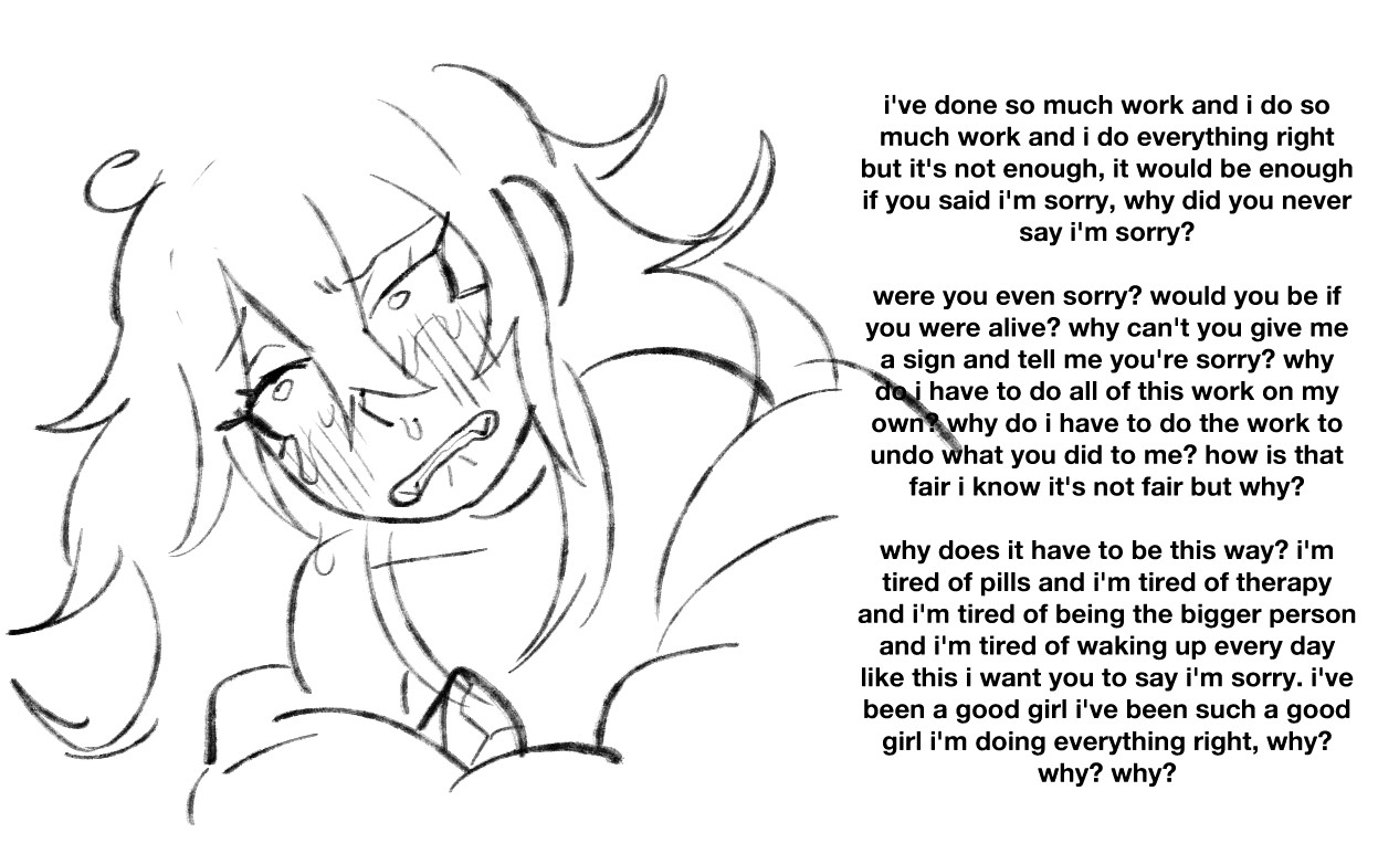 >>82336786>>82337302It didn’t matter, regardless of the truth, Jeremiah settled into her attentions. HIs body still twitched a little, he still shuddered and whined when a sore spot was prodded. Slowly though, he came to lift his head and look up to the girl again. His eyes were red, a few tears had trailed down his face and wetted the ground, his skin was bereft of much else in terms of colour, but still… he gave her a weak smile. – “Thank you…” – It was a weak voice that expressed this gratitude, he thanked her for everything, both for the punishment and for the care.Jeremiah, after all, deserved whatever Sibylla would do unto him.(excuse the wait)