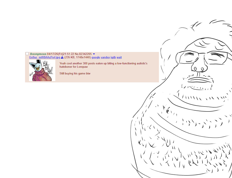 Yeah cool another 300 posts eaten up biting a low-functioning autistic's hateboner for LorepawStill buying his game btw