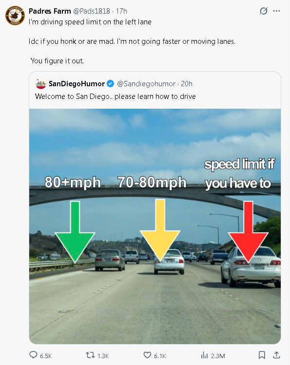 >>2843772in good states you can get pulled over for not passing in the left lane and causing traffic, but ive rarely seen it happen. there are even some highways with signs saying the left lane is for passing, always. if you only feel safe driving the speed limit, you shouldn't be driving.