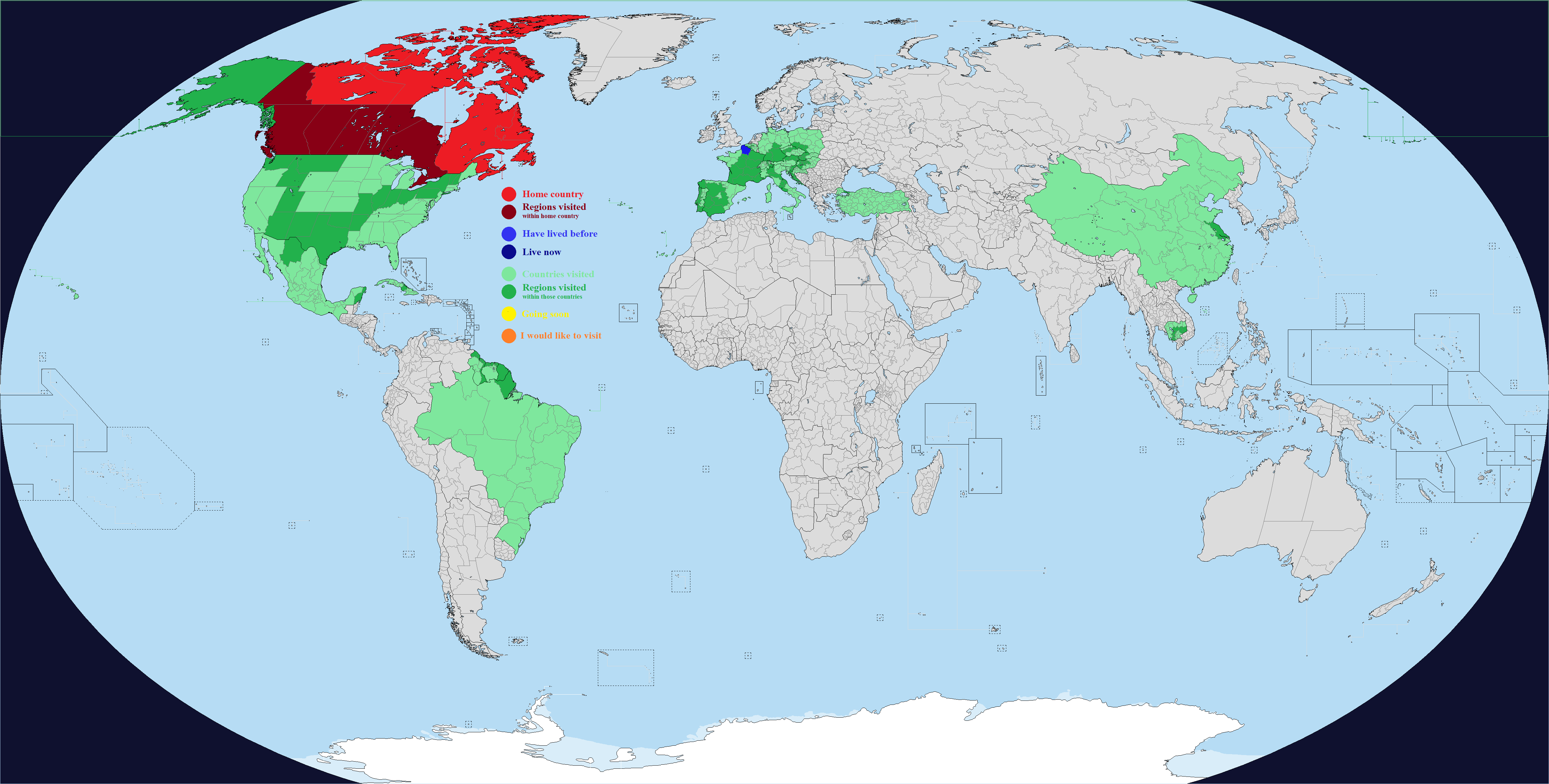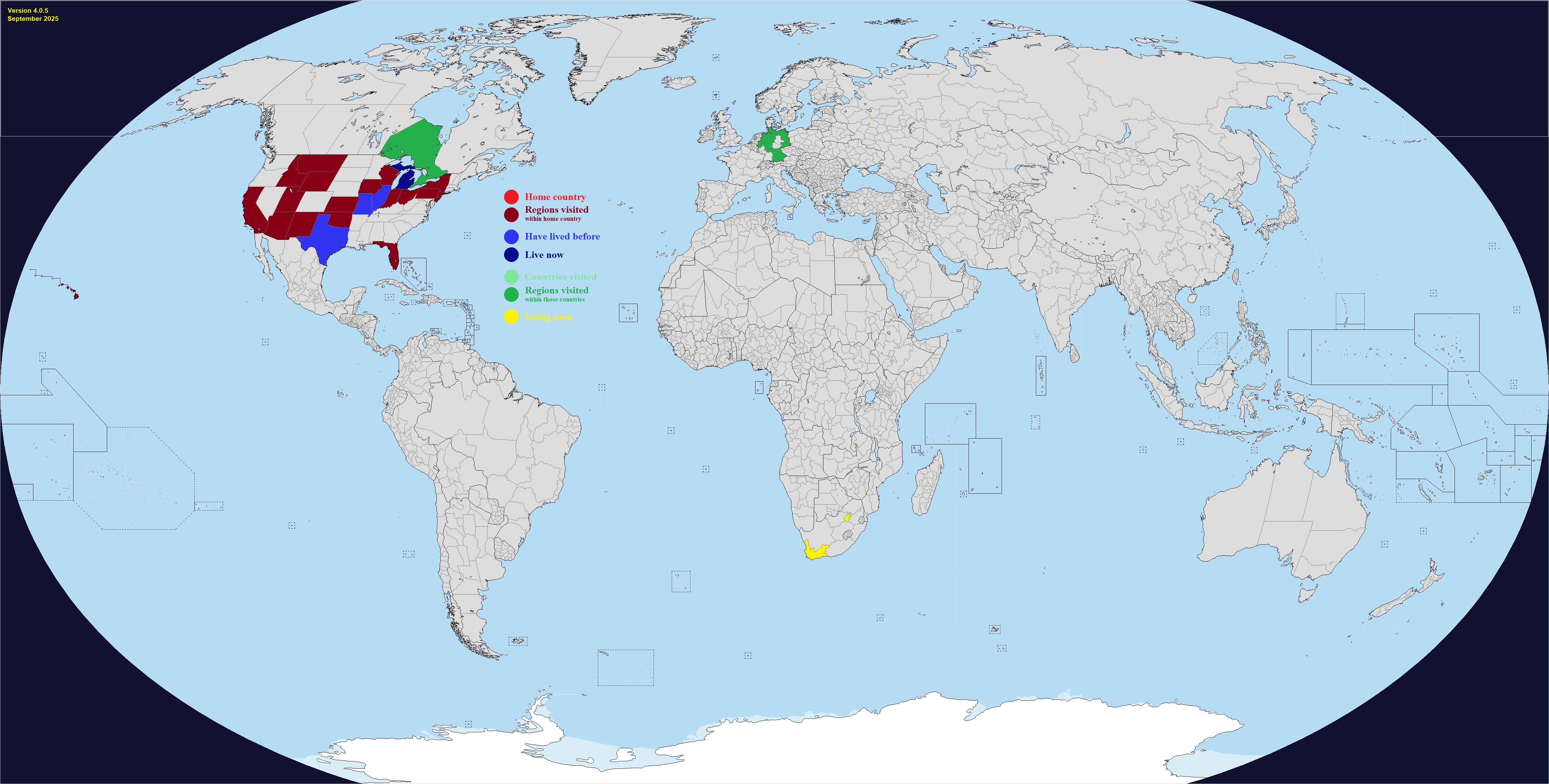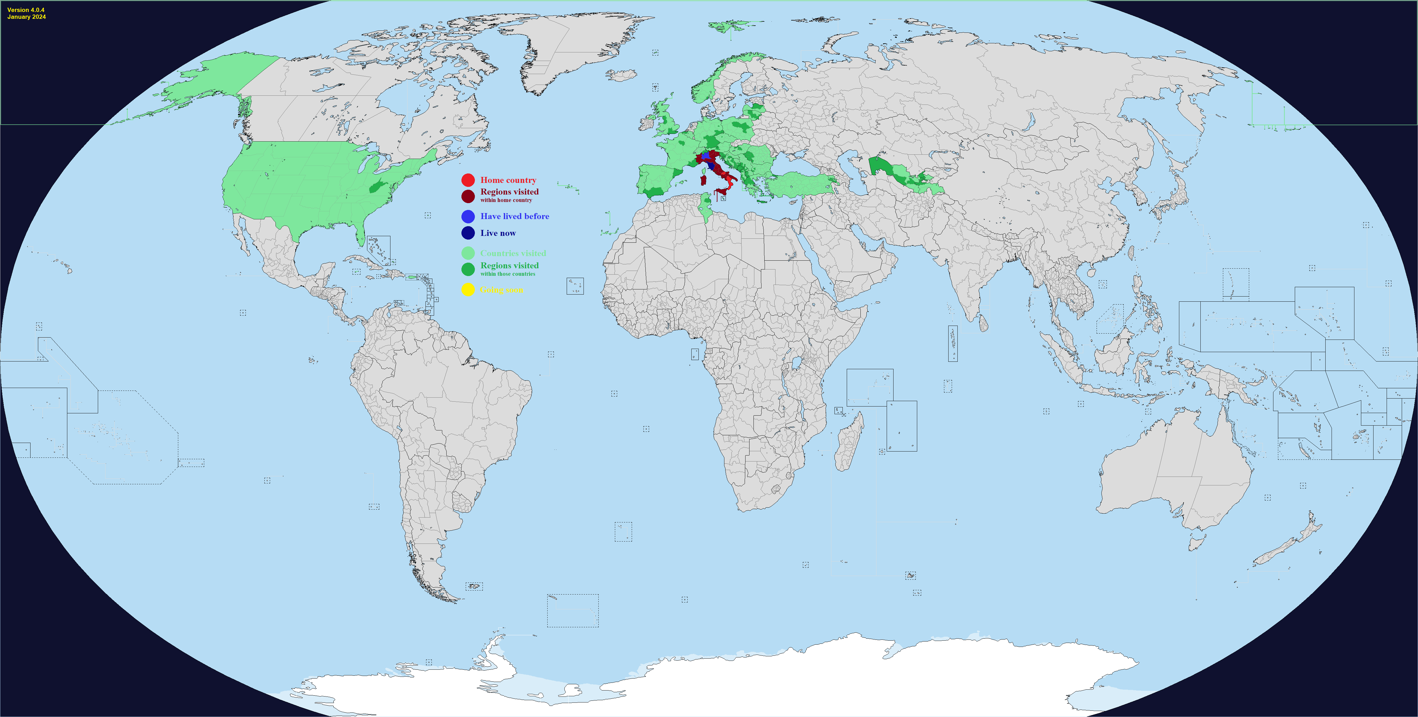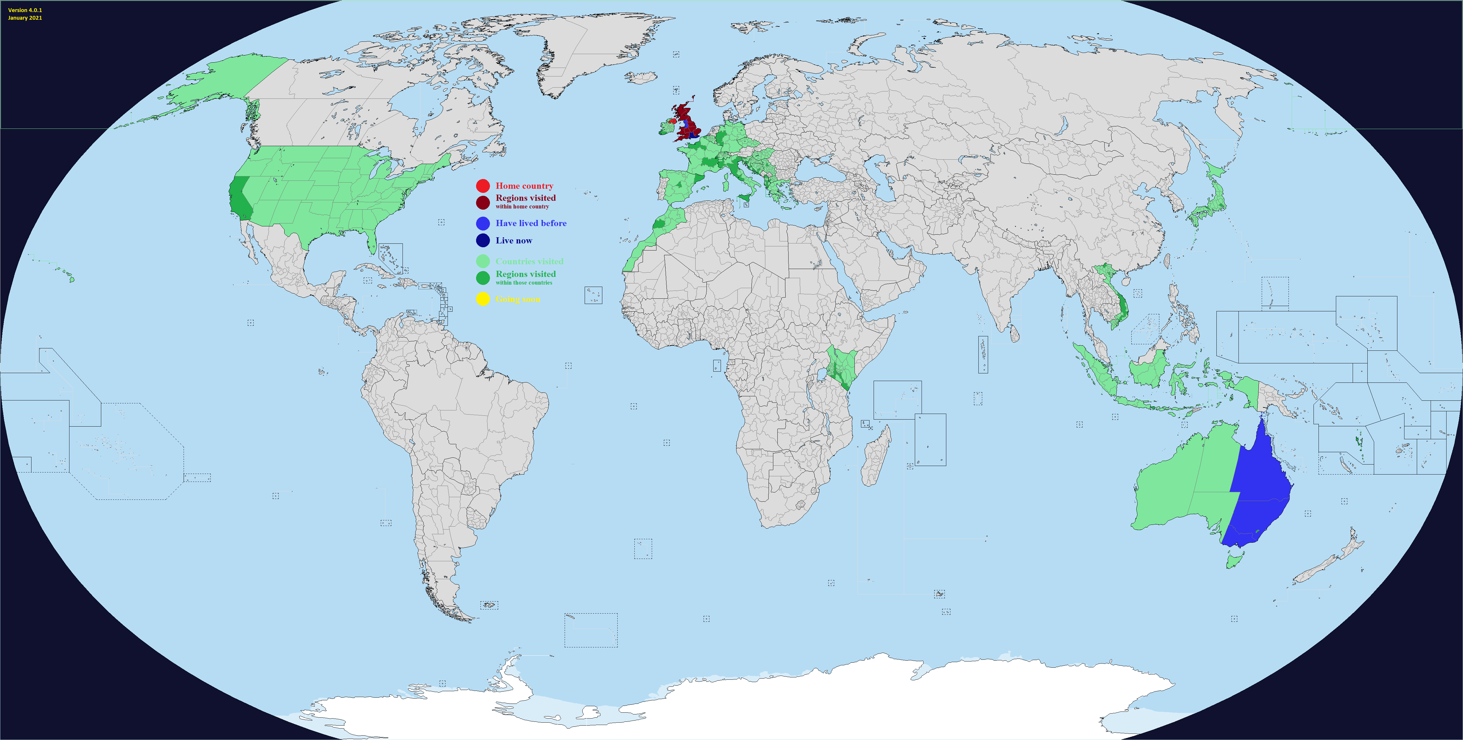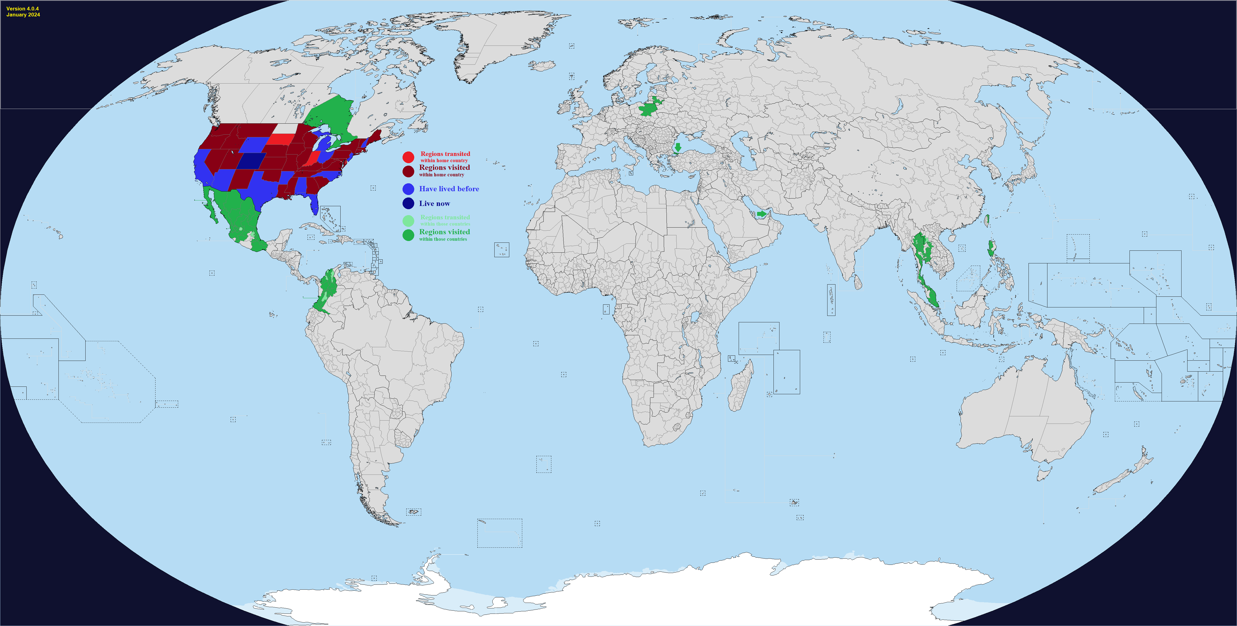 This map comes with "DLC", which are optional regions you can add for a few select countries. It's hard to make a good Real Traveler's Map without having some regions be too small or too large, or sometimes the official divisions are not perfect for a traveler for whatever reason. Up to you if you want to change one or more countries. Feel free to add or suggest others if you want.What counts as having visited or lived in a subdivision? Completely up to you, use your own definition. If you need official guidance however, I personally like this Anon's post:https://archive.4plebs.org/trv/thread/2337267/#2340603In short, any visit of any length counts as a visit as long as you made a conscious effort to go there for touristic reasons. This excludes layovers and transits and such, but includes short visits such as leaving the airport for a few hours during a layover. For living, more than a month for non-touristic reasons, meaning you could travel around while there, but the reason you went was work or study or such.