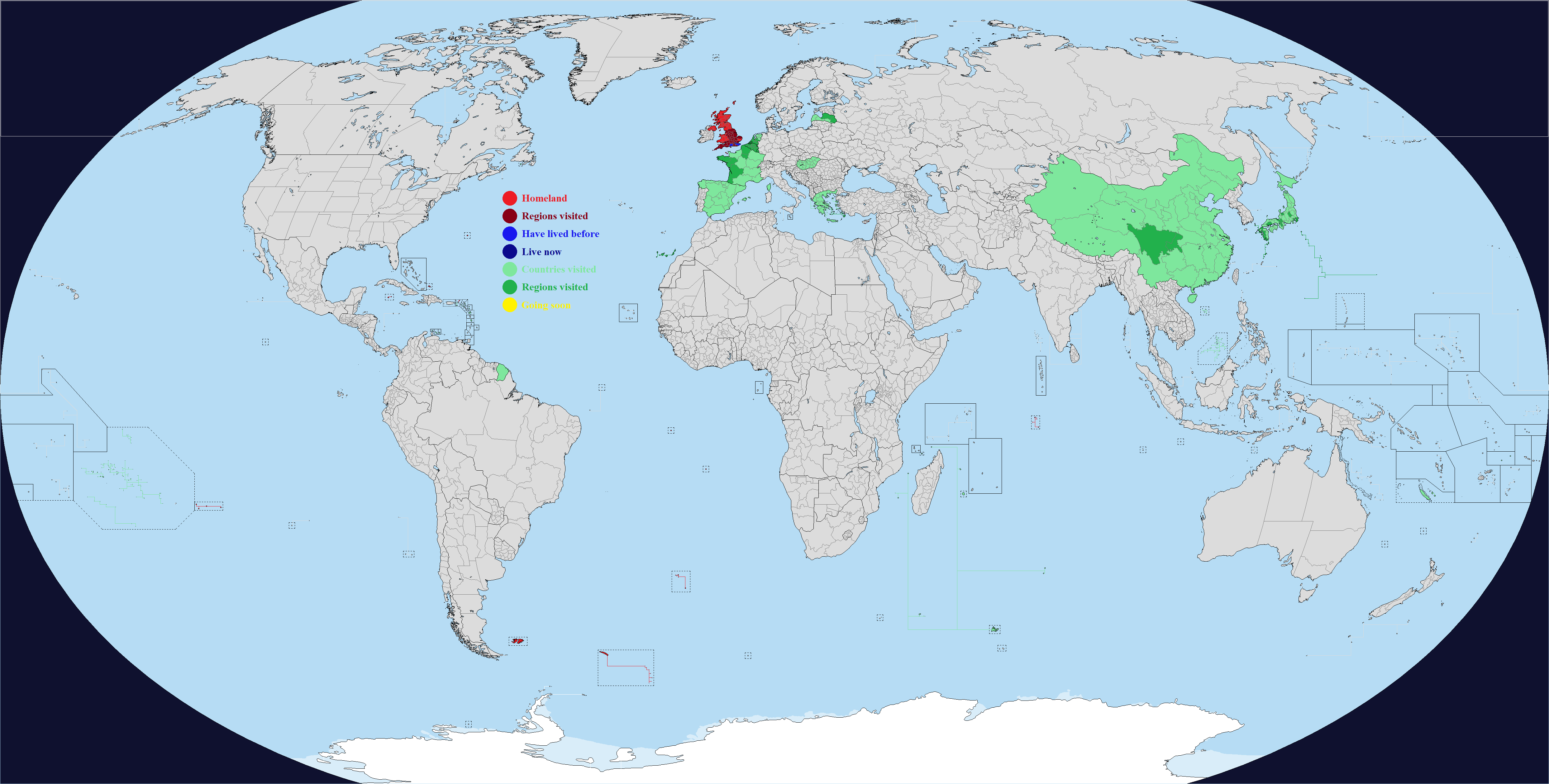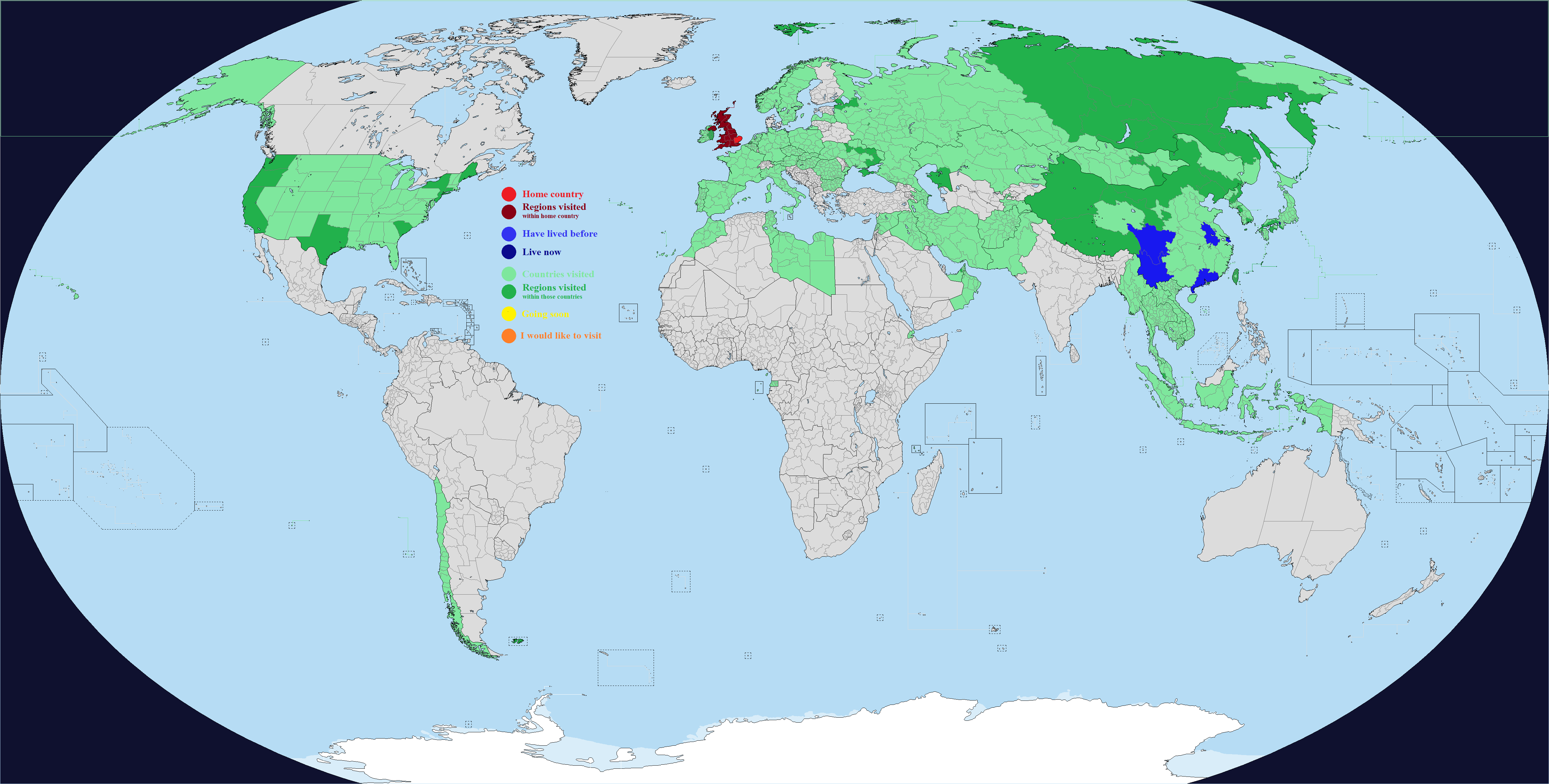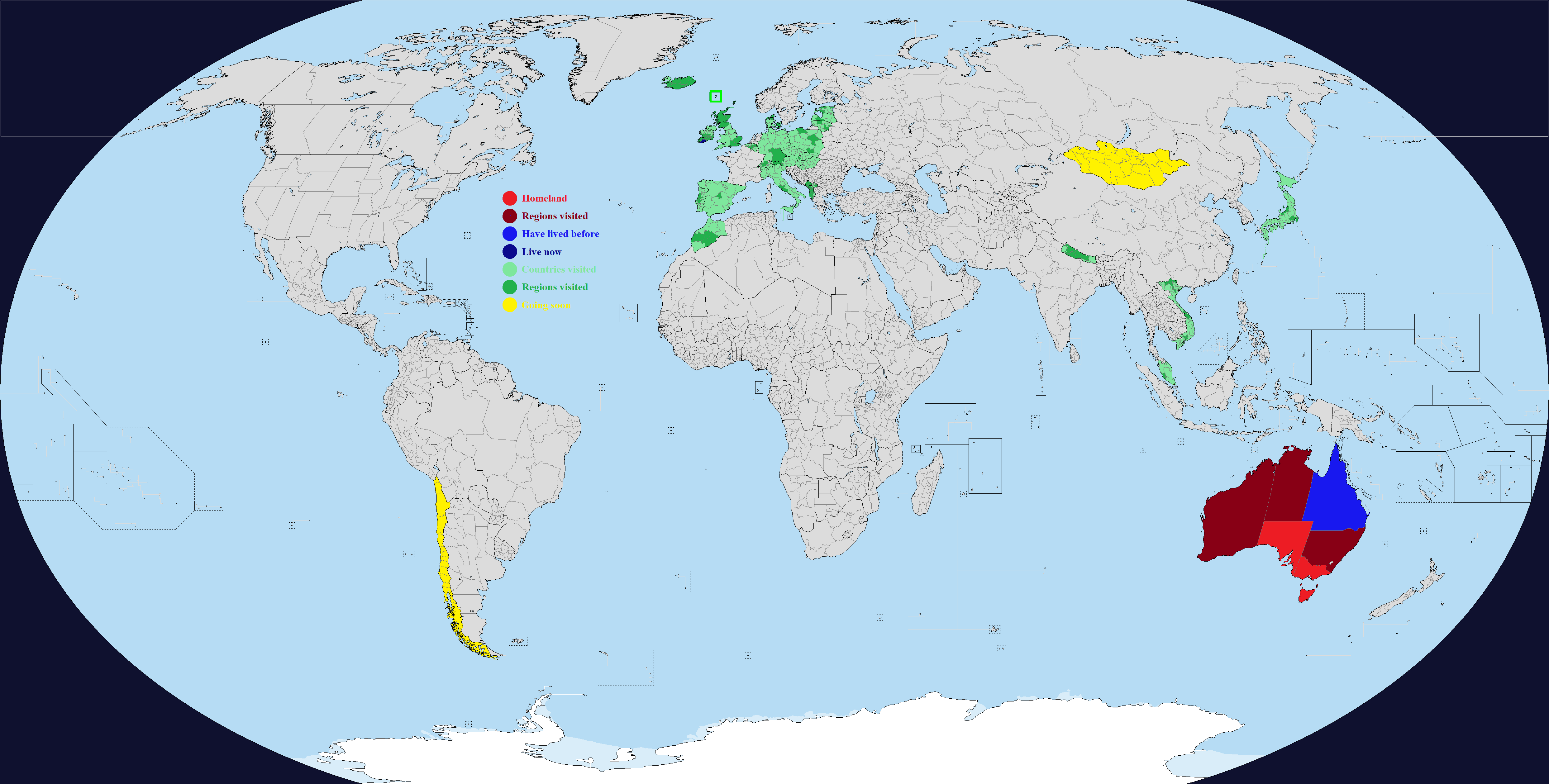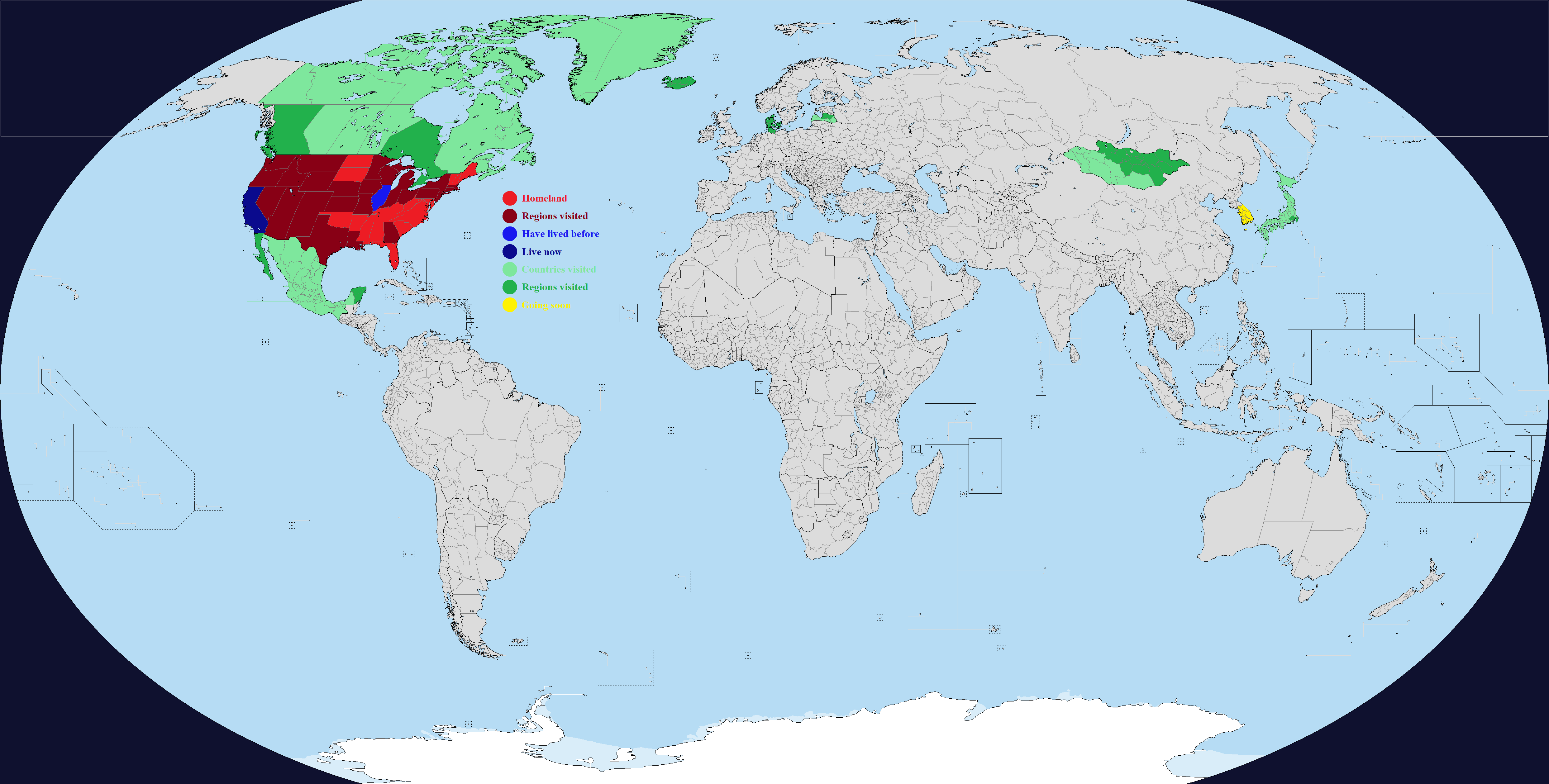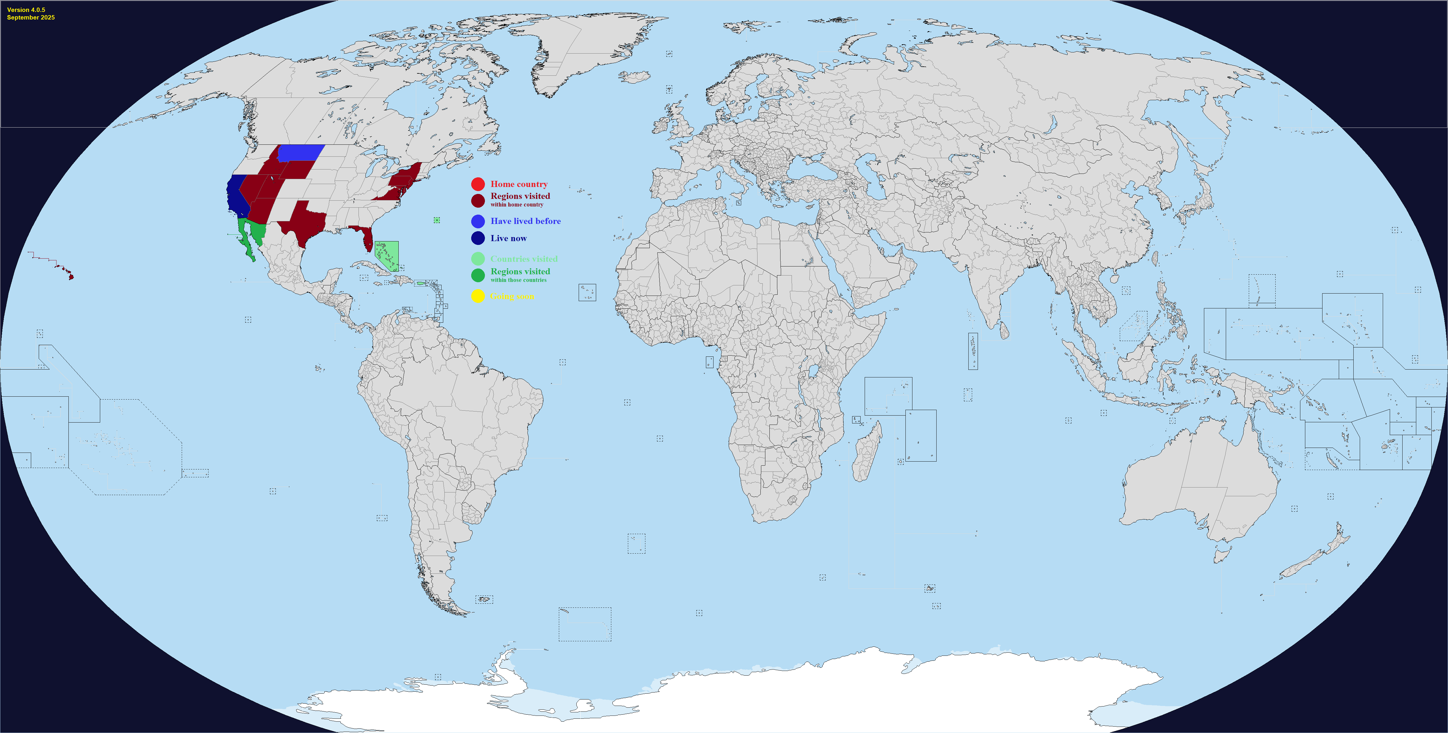 This map comes with "DLC", which are optional regions you can add for a few select countries. It's hard to make a good Real Traveler's Map without having some regions be too small or too large, or sometimes the official divisions are not perfect for a traveler for whatever reason. Up to you if you want to change one or more countries. Feel free to add or suggest others if you want.What counts as having visited or lived in a subdivision? Completely up to you, use your own definition. If you need official guidance however, I personally like this Anon's post:https://archive.4plebs.org/trv/thread/2337267/#2340603In short, any visit of any length counts as a visit as long as you made a conscious effort to go there for touristic reasons. This excludes layovers and transits and such, but includes short visits such as leaving the airport for a few hours during a layover. For living, more than a month for non-touristic reasons, meaning you could travel around while there, but the reason you went was work or study or such.