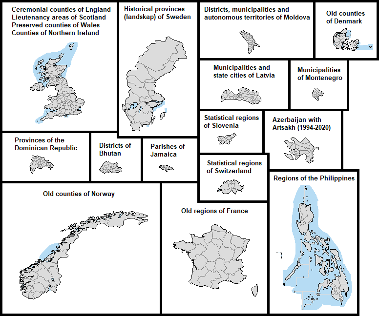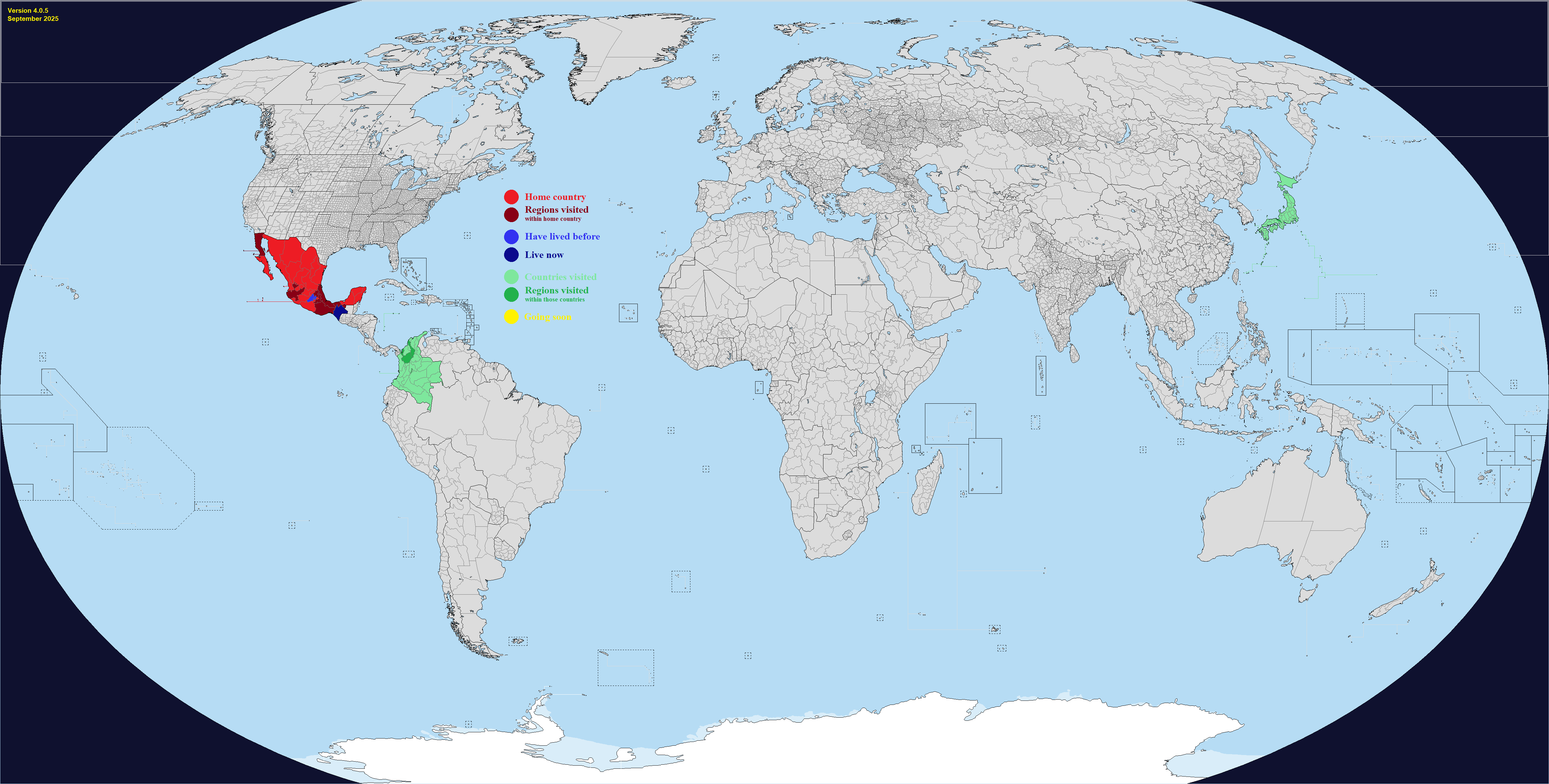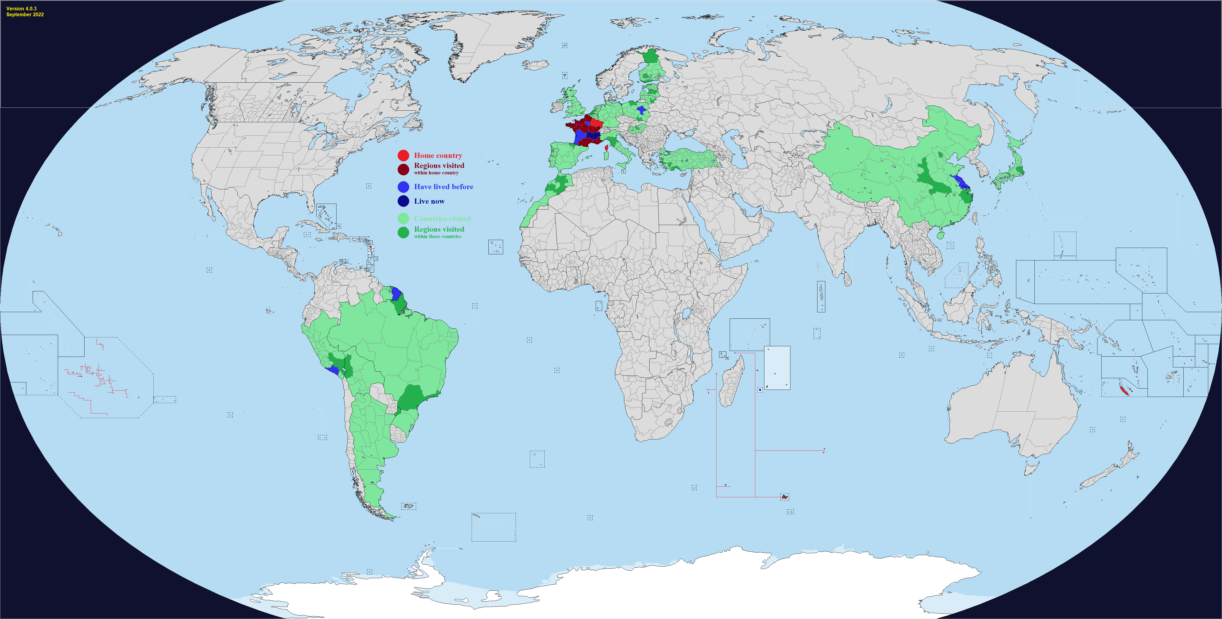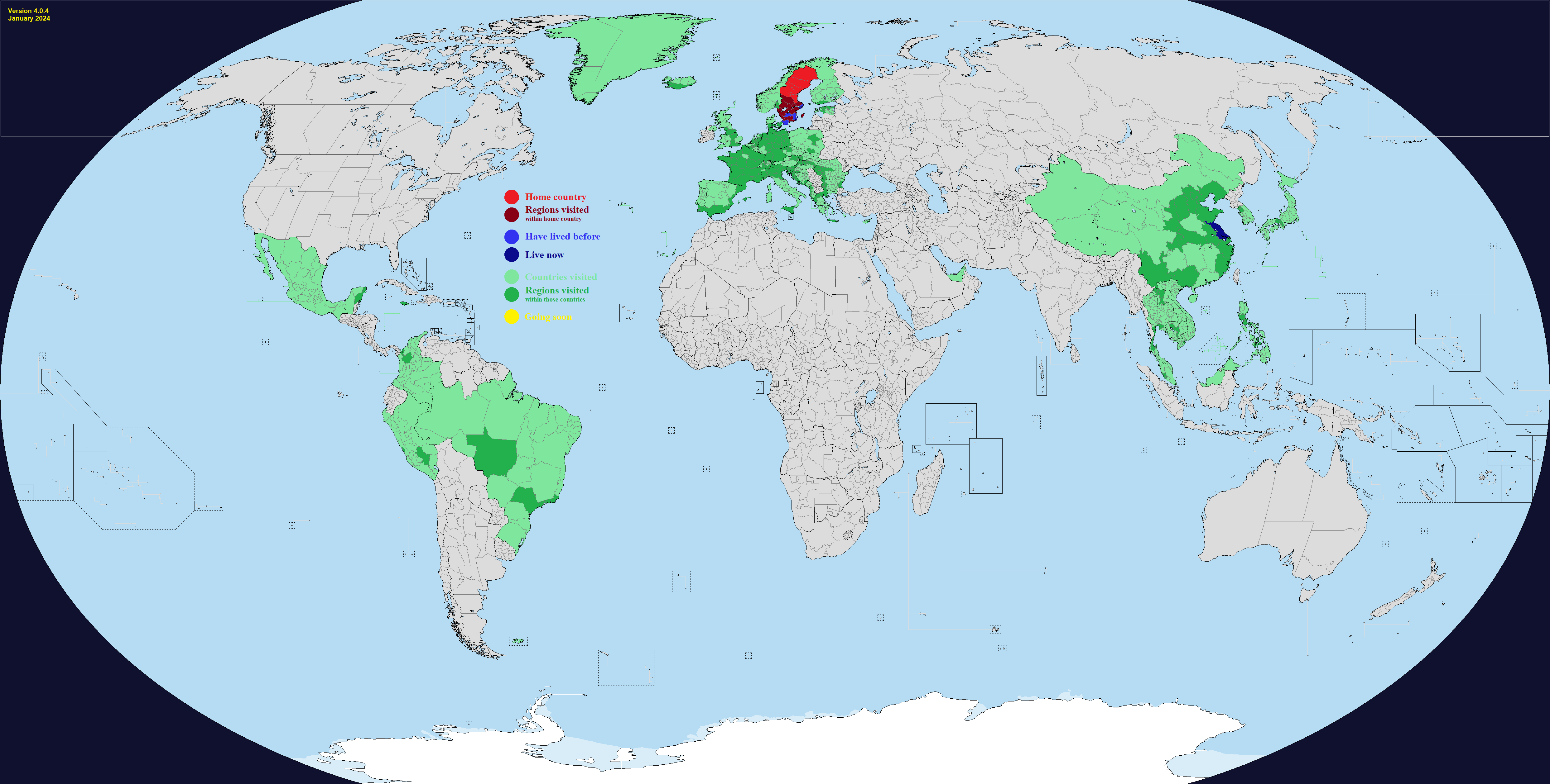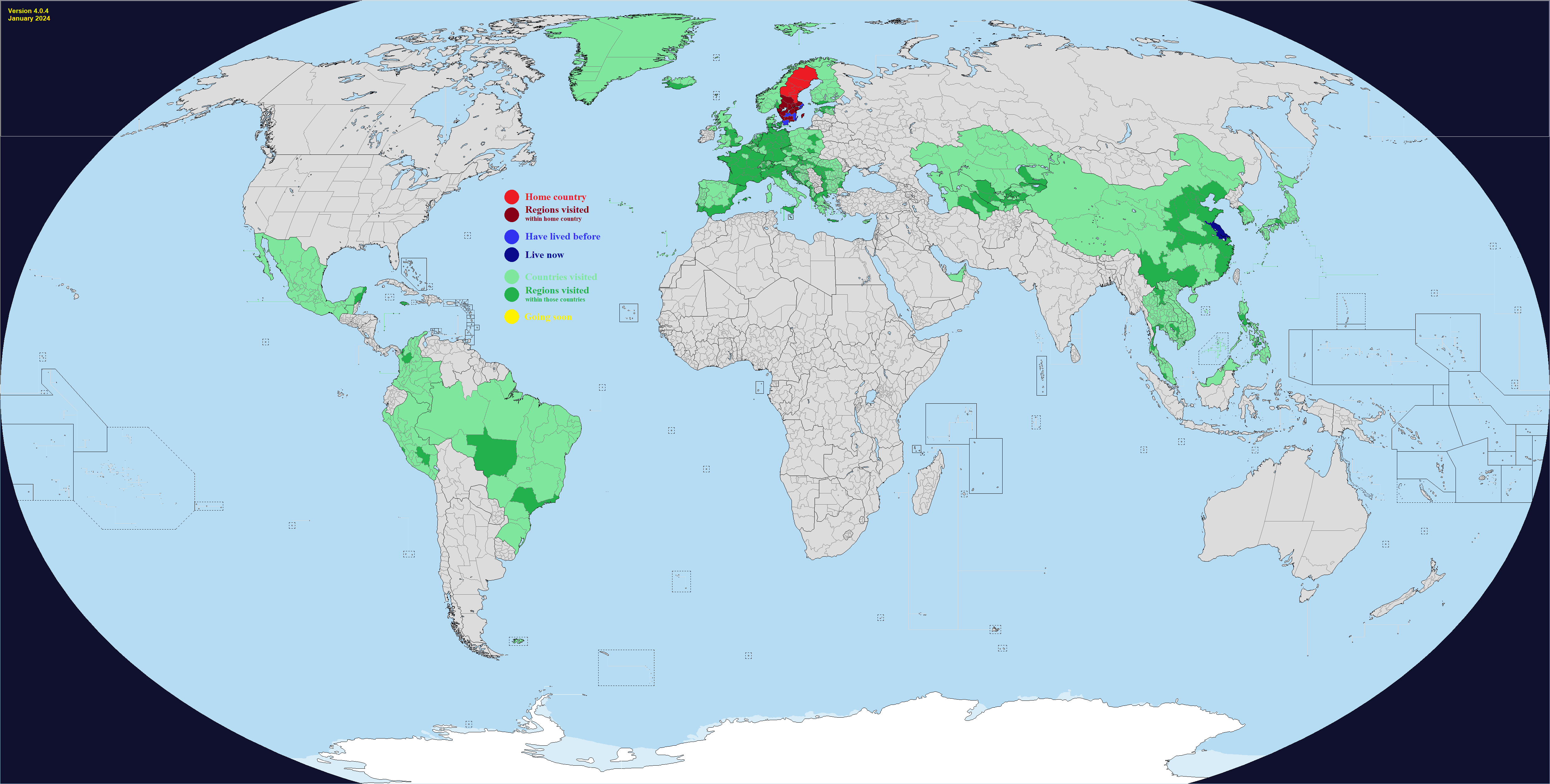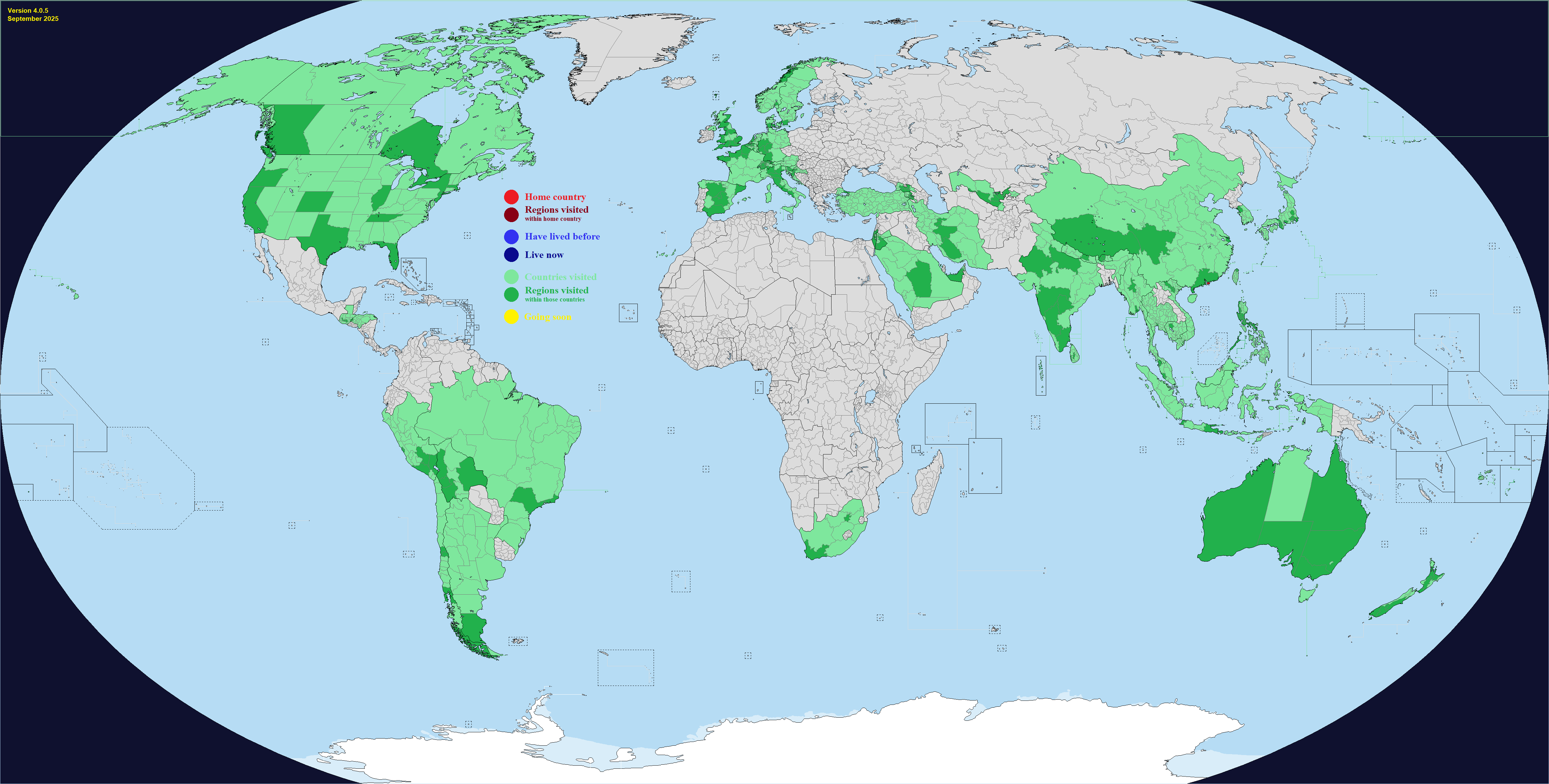 This map comes with "DLC", which are optional regions you can add for a few select countries. It's hard to make a good Real Traveler's Map without having some regions be too small or too large, or sometimes the official divisions are not perfect for a traveler for whatever reason. Up to you if you want to change one or more countries. Feel free to add or suggest others if you want.What counts as having visited or lived in a subdivision? Completely up to you, use your own definition. If you need official guidance however, I personally like this Anon's post:https://archive.4plebs.org/trv/thread/2337267/#2340603In short, any visit of any length counts as a visit as long as you made a conscious effort to go there for touristic reasons. This excludes layovers and transits and such, but includes short visits such as leaving the airport for a few hours during a layover. For living, more than a month for non-touristic reasons, meaning you could travel around while there, but the reason you went was work or study or such.