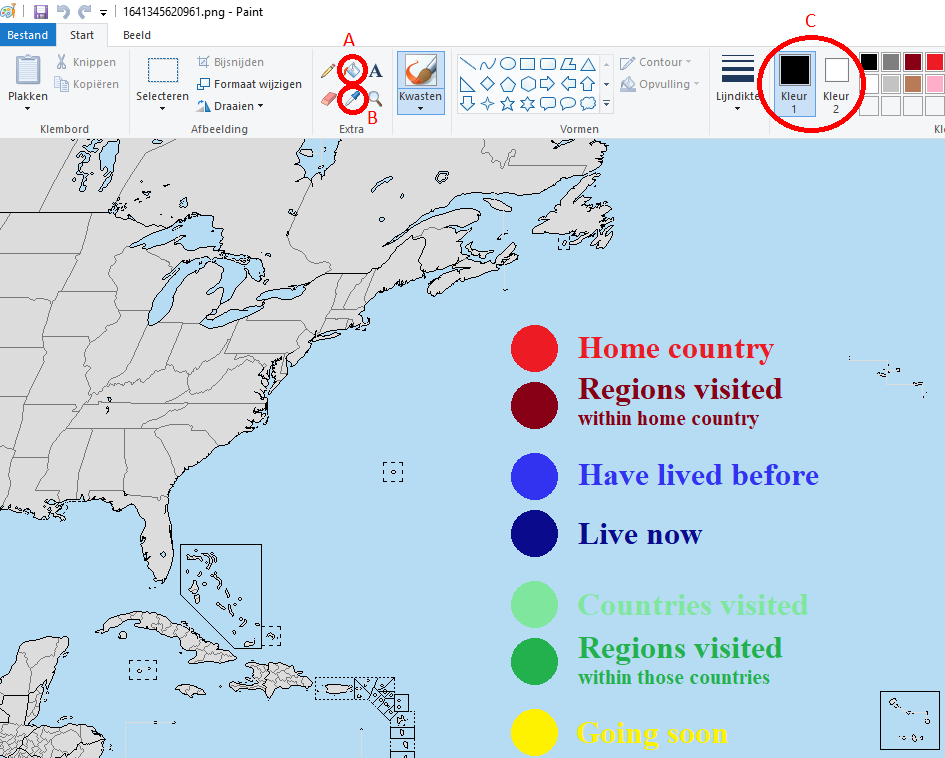 Instructions on how to use the map with MS Paint, courtesy of Dutch Anon.How do you fill in the map? It's very easy. You only need to use two buttons, which I have circled in red.Say you want to colour a specific region light red, you click the tool that I marked B, and you'll see your cursor takes the shape of that tool. Then you left click the colour you want to use, i.e. the big circle. You'll notice that colour 1, which I marked C, changes to light red.If you repeat this process but you RIGHT click a coloured circle instead of left clicking it, you will select the colour as colour 2. Let's click dark red. This way you can have both shades of red selected at the same time, which makes colouring in the map more convenient, especially when doing big countries.Now you select the tool which I marked A. Let's get to colouring. Say you want to colour Indiana in light red and you want to colour Ohio in dark red. Easy. Left click Indiana and right click Ohio.