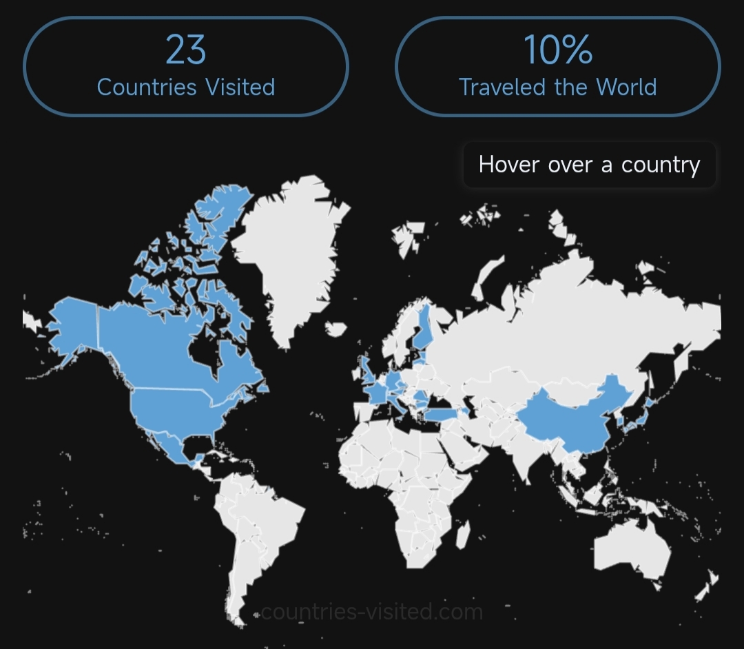 Literally just started traveling on my own for the first time this year at 25. Everything outside of Germany is just family trips from years ago or places near me. I've been traveling around my own region lately, seeing new places in states I've already been, which isn't reflected on this map.In October I'm taking a New England road trip, In November I'm in Quebec, and then in December, I haven't fully decided, but I'm either going somewhere new in Europe, or to the freaking Caucasus in Georgia/Armenia