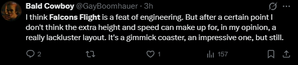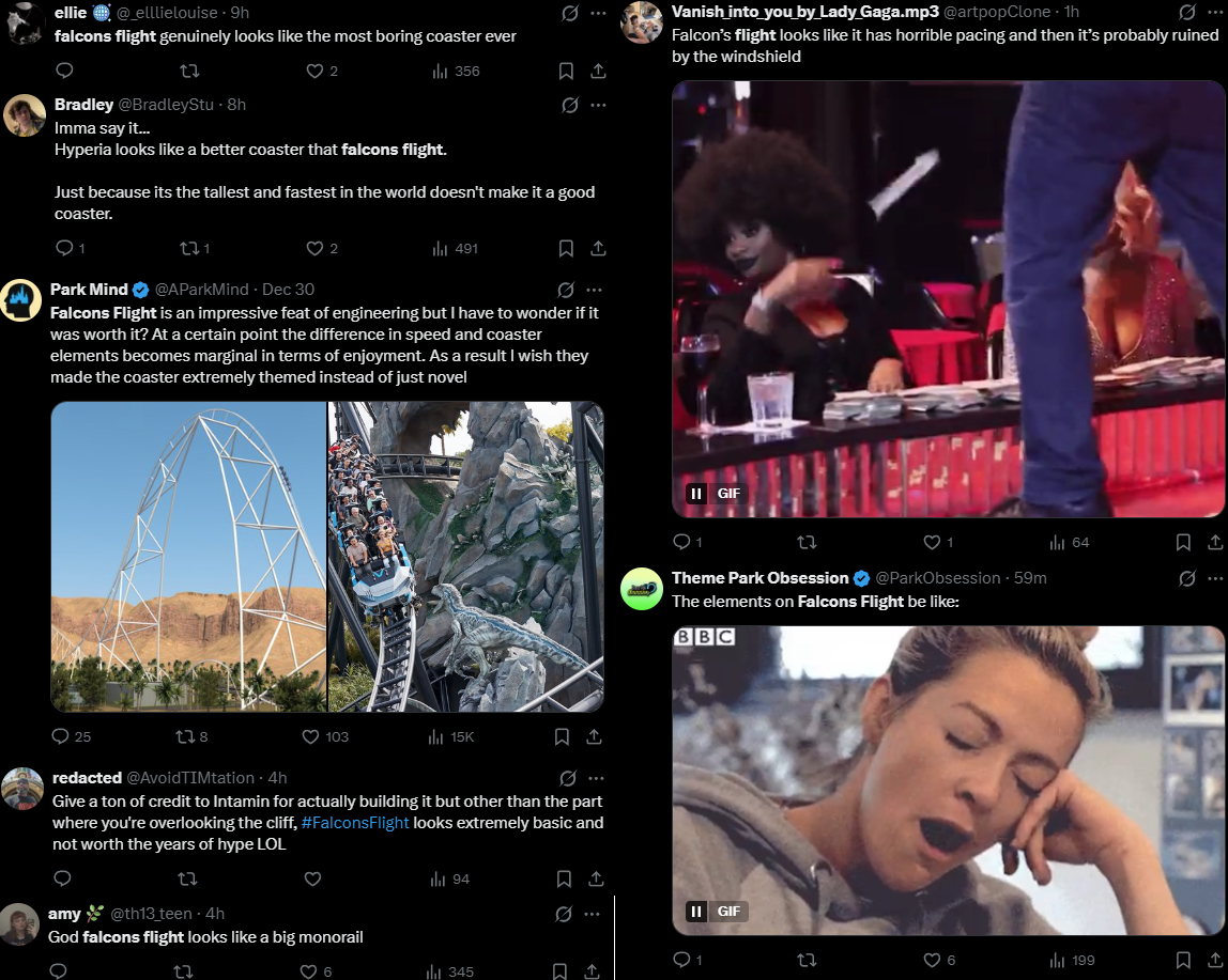 Some early reviews for Falcons Flight are coming in from some of the coaster diehards since the park is running previews, and the current consensus is it is a great ride but underwhelming for its size and not GOAT material, and some saying not even the best at that park