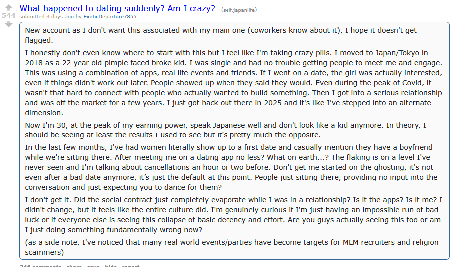 I'm in japan right now for the third time and every time it's hell because theres just so many cute girls everywhere, and also the overwhelming certainty that most of them will never want anything to do with you because you're a gaijin. It's some sort of spiritual hell. And I'm only getting older só it only gets worse