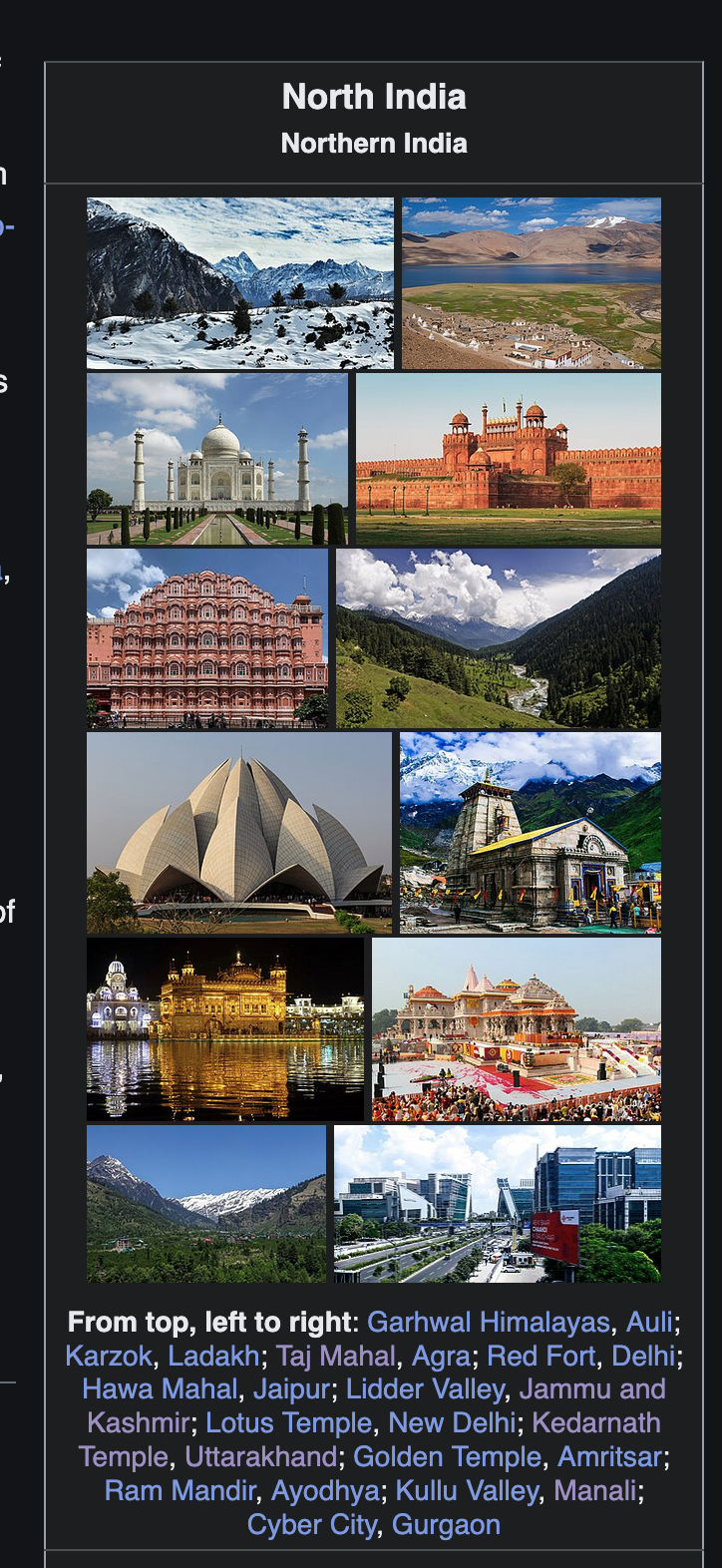 >>2864866I start by searching places that seem kind of interesting. Then I pan around google maps and click on random places, saving anything that seems like it might be worth visiting. I also google stuff in google images. All the top results are very basic and touristy, but when you click on an image, you get some related images. Sometimes those are more interesting. Then I keep clicking on related images and find increasingly cool stuff. Those places sometimes end up being in different cities entirely, so then I repeat the process with that new city.I also look up wikipedia articles about places. Usually there's a few pictures of some minor historical place or some neighboring place. It's also good to look at articles about that country's actual history, because that's bound to have photos of historical locations or some natural landscapes.For example, the wikipedia article for North India has some cool pictures right at the top, with locations mentioned. Click and follow the links for each of those and you'll find some cool stuff. Click on links inside those articles to things that seem interesting and you'll find even more interesting things. Then it's a matter of determining what places are the most interesting to you.