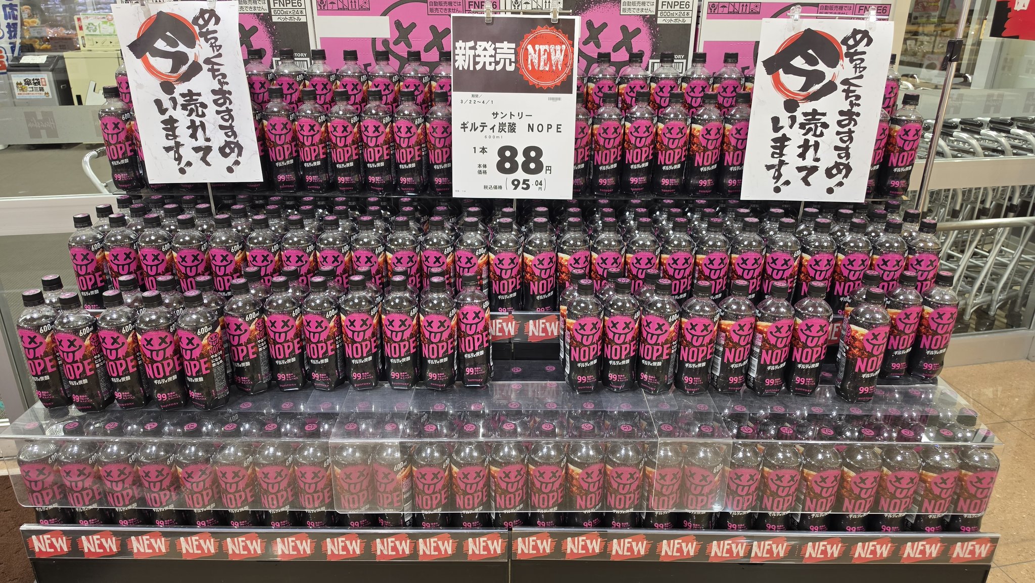 Suntory's NOPE soft drink is the most controversial drink in Japan right now. People either hate it or love it. The cheapest place to buy this NOPE drink for only under 100 Yen is from the grocery store while convenience stores and vending machines are selling this NOPE drink for 140 Yen to 200 Yen>Suntory launched a new drink called Guilty Carbonated NOPE' on March 24, 2026, which combines 99 kinds of fruits and spices to create a flavor that stimulates the five basic tastes.https://x.com/NOPE_jphttps://www.youtube.com/watch?v=BluZ5kExfrg