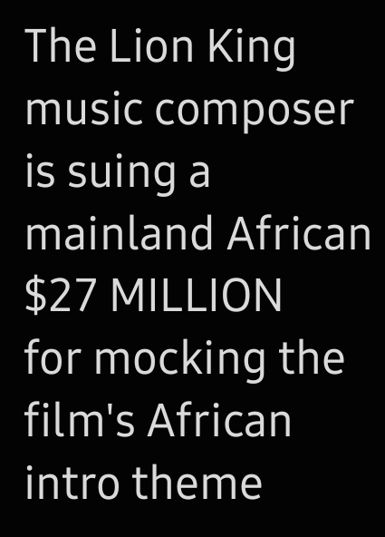 ITT movies that are illegal to joke abouthttps://m.youtube.com/watch?v=uK2oFq5d4lwThe Lion King music composer is suing a mainland African $27 MILLION for mocking the film's African intro theme
