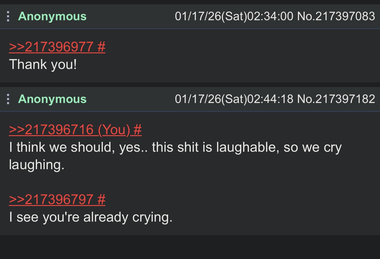 >>217396716I think we should, yes.. this shit is laughable, so we cry laughing.>>217396797I see you're already crying.