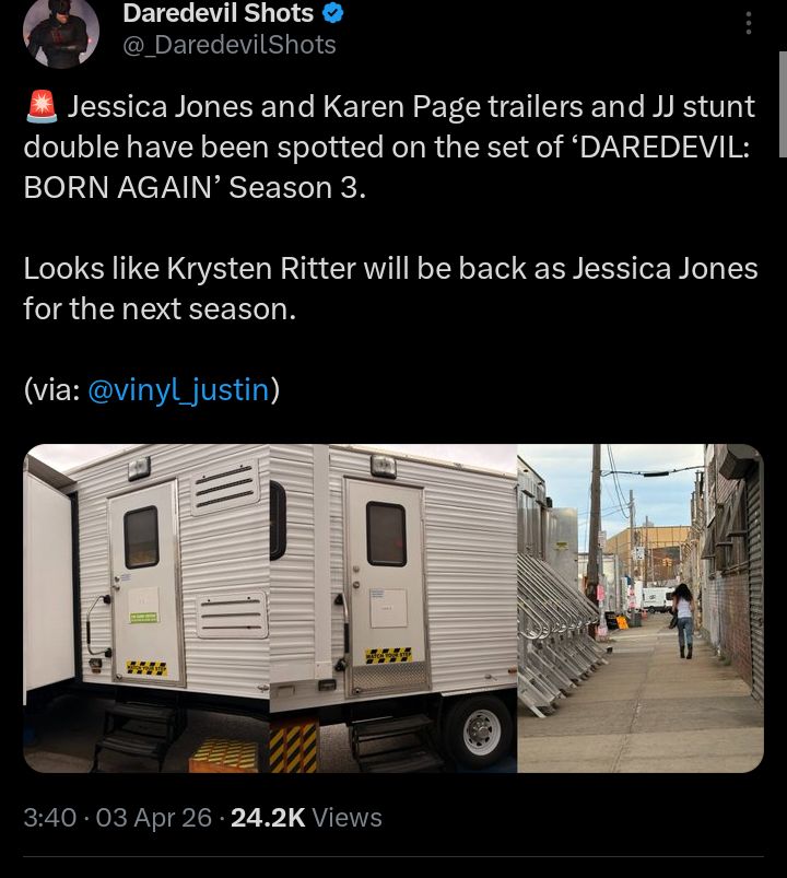 Daredevil Born Again S3 is filming right now. Jessica Jones confirmed to return.