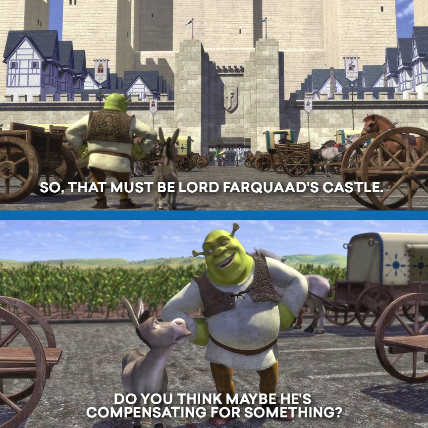 >>217339711At that moment Shrek is joking about penis size, but while he is correct that it is compensating, it's actually about Farquaad's height, which he is insecure about.