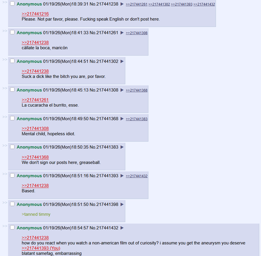 >>217441238how do you react when you watch a non-american film out of curiosity? i assume you get the aneurysm you deserve>>217441393blatant samefag, embarrassing