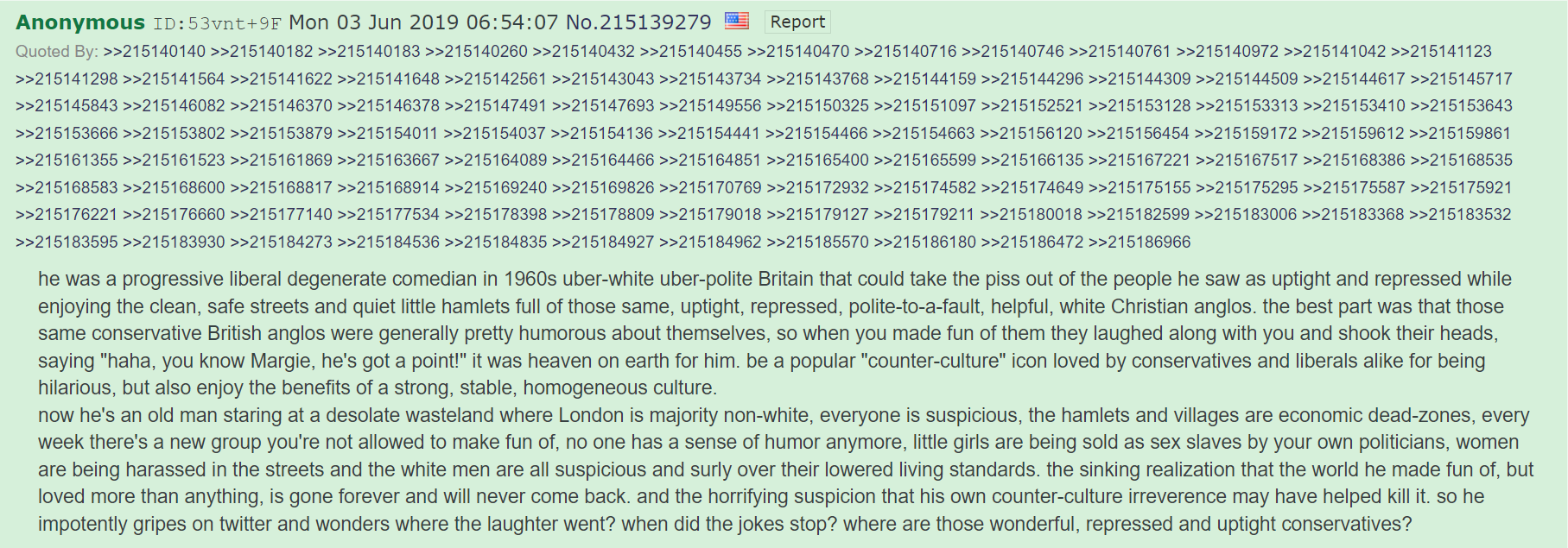 >>217074055Of course. There are also movies with strongly conservative political ideas, like The Dark Knight and Ghostbusters, though they at least didn't beat you over the head with it.What I'm saying is activists like Schrader ruined film as a political messaging device by confusing "serious film" with "me broadcasting my Very Important Opinions to everyone"I can't get over the fact that he's so out of touch that he thought that's WHY people went to movies! To hear his political opinions! Like he thought there were millions of Americans who turned off the 6 o'clock news every night, held their heads in their hands, and said "If only there was a movie I could pay to see, that could tell me what to think about all this!"