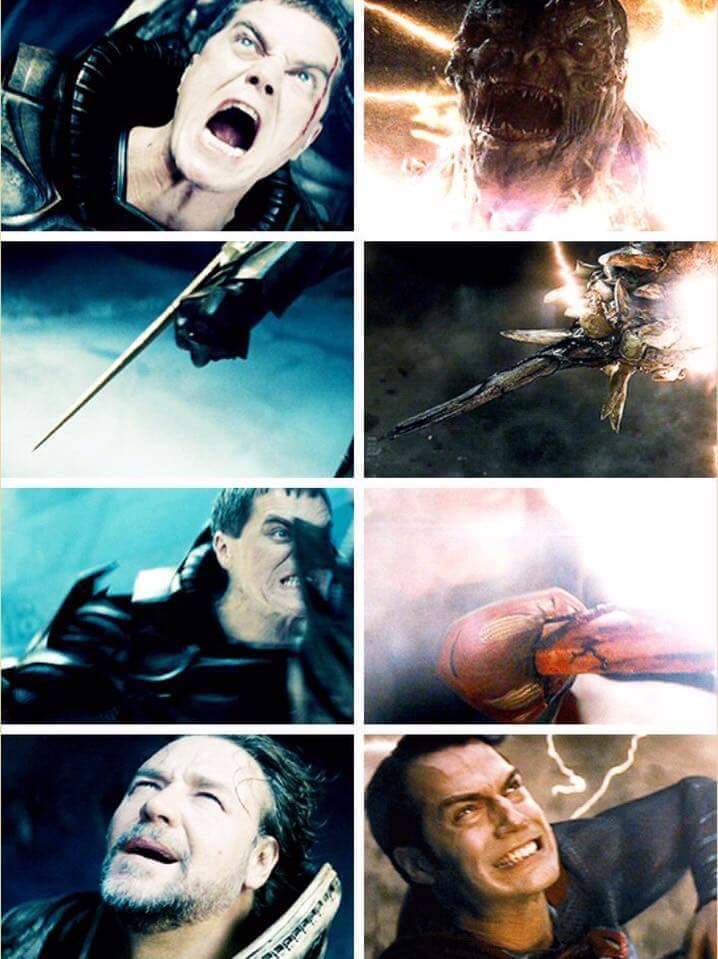 >>219363544 Dude, it’s one thing to point out that many of the lines in MoS and BvS aren’t Snyder’s inventions but come from comics like All-Star Superman and The Dark Knight Returns, or that when Snyder filmed MoS, most of these lines weren’t meant to perfectly fit into a trilogy. But it’s just foolish to suggest that none of this was intentional. It’s clear as day. There are actual interviews where Snyder talks about some of it. Take, for example, my picture showing Doomsday killing Superman in BvS, which directly mirrors the way Zod killed Jor in MoS, with the added twist that in BvS, Doomsday is actually the reanimated corpse of Zod. On top of that, the scene nods to a moment in Excalibur, the 80’s film about the King Arthur legend, where Mordred impales King Arthur. In that movie, Mordred embodies Arthur’s sin, a concept echoed in BvS, where Doomsday symbolizes Superman’s sins from MoS.