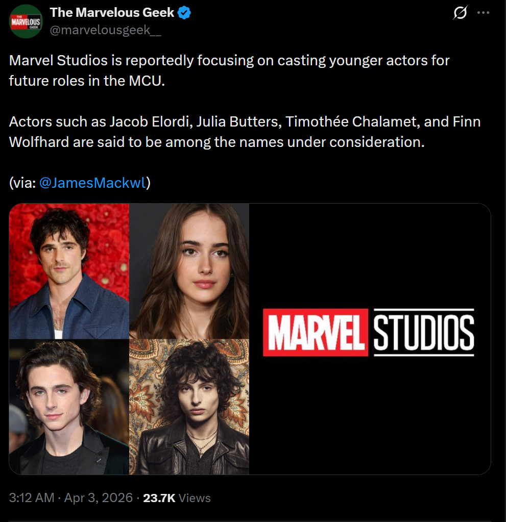 >>219278543For what roles? And this doesn't even make sense for Timothee Chalamet, who is too pretentious to ever want to star in capeshit. And Jacob Elordi turned down even auditioning for Superman. Why would he want to be in Marvel?