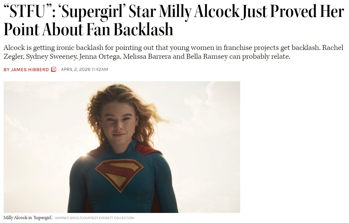 >But the response to Alcock in many online corners has been as if the actress went on a militant feminist rant slamming all male fans and threw a massive pity party for herself.>One gripe being made by some fans is that whenever a project isn’t successful and has a female or Black lead — especially titles made by Disney — that those creatively responsible suggest fans were too sexist or racist to appreciate their efforts. But Alcock never even suggested Supergirl would get backlash, only that she expects to get personally objectified and trolled (which … she is).>Others counter that some female action icons in the past have universal acceptance, like Sigourney Weaver in Aliens and Linda Hamilton in Terminator 2. But it’s rather easy to cite legendary performances from decades ago and say: Look how accepting we are.https://www.hollywoodreporter.com/movies/movie-features/supergirl-milly-alcock-backlash-women-franchise-1236553579/