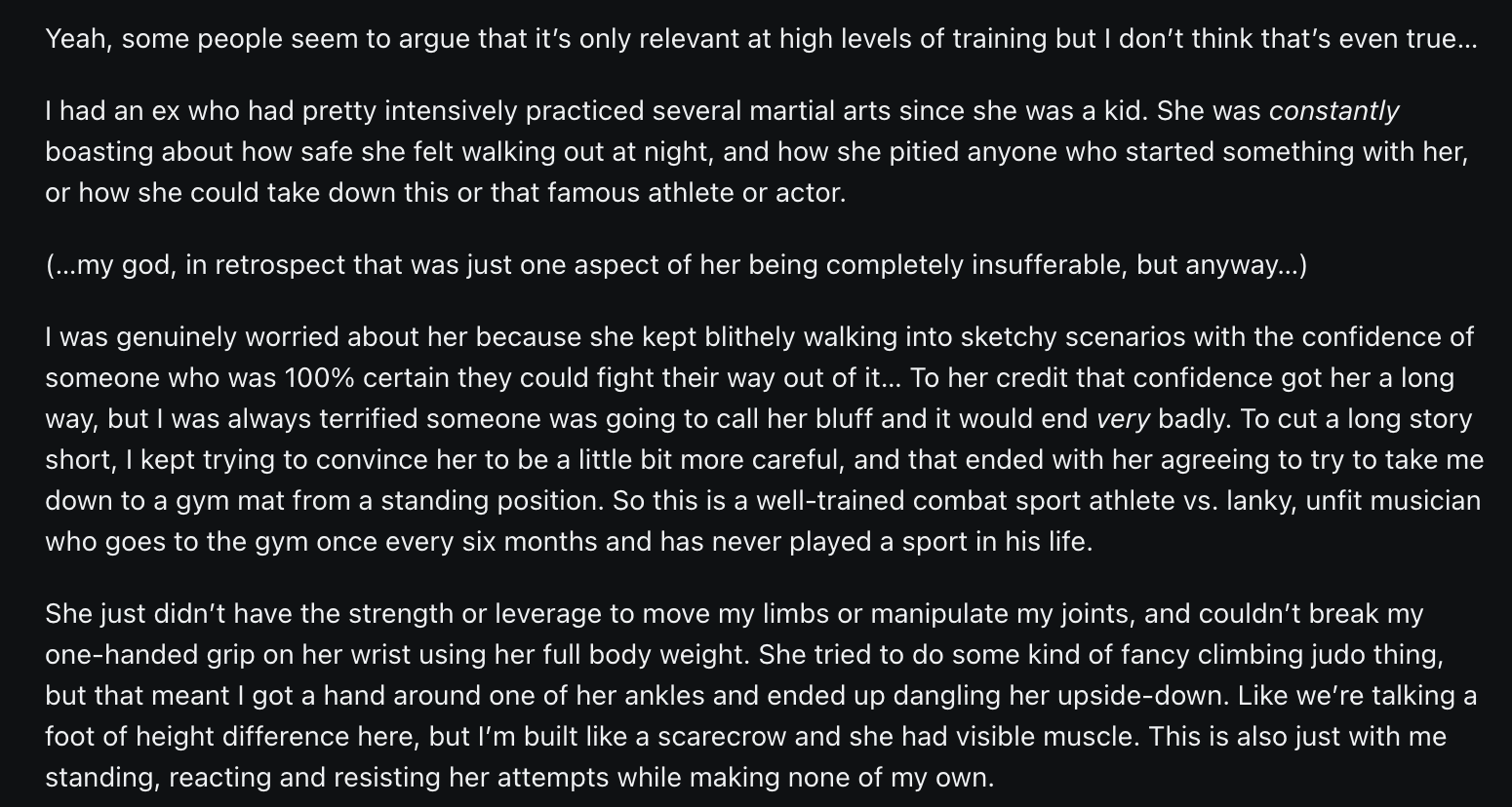 >>215554144if she took real self defense classes she would've just smashed his balls or gouged his eyes then went home