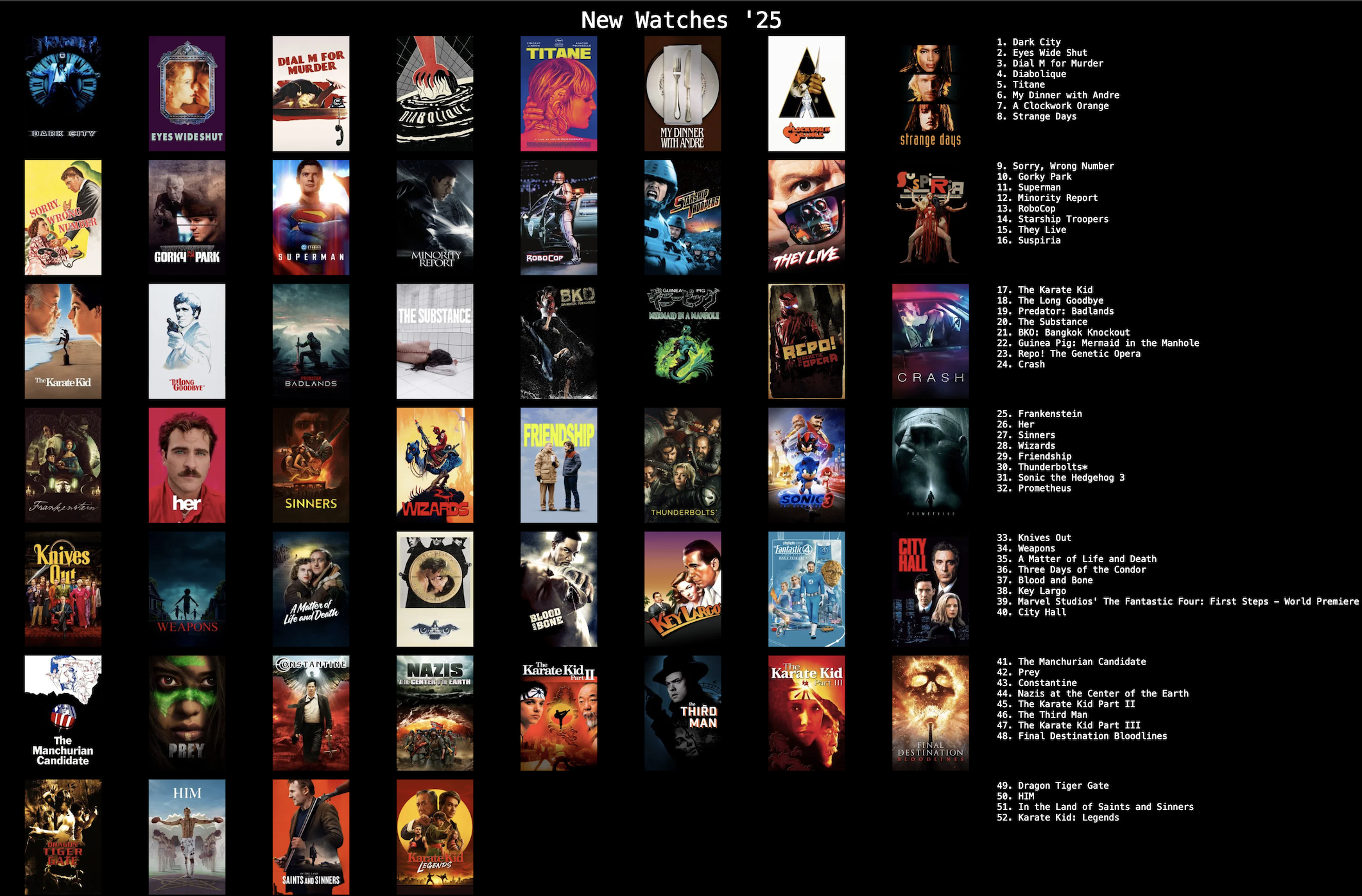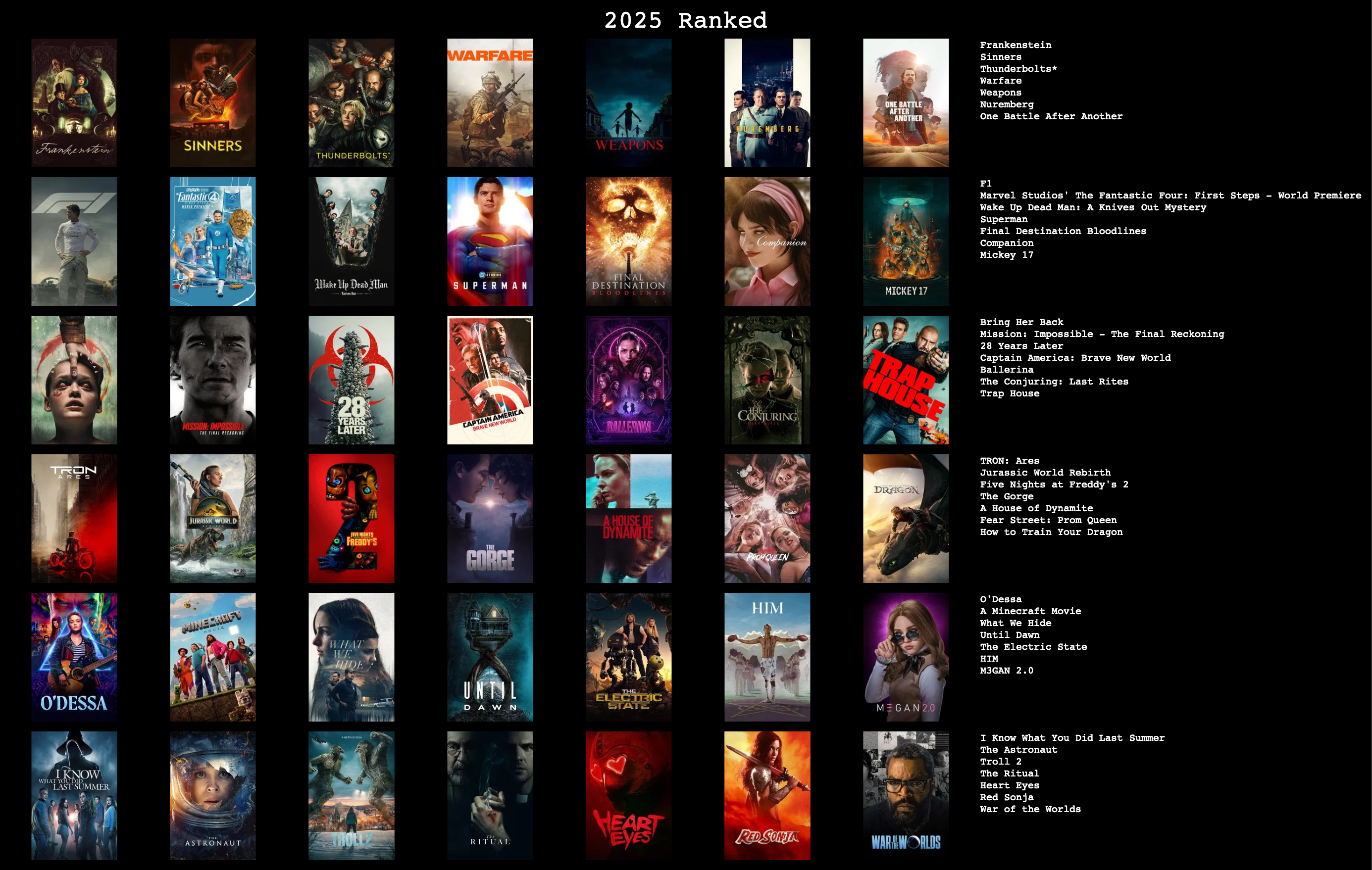 Here is my ranking for my favorite new movies I watched in 2025. Please share some of your favorites and make recommendations based on rankings. Anyone ridiculing other's taste itt MUST post their top 5 movies of the year, else be labeled a pussy. Here is a link to the ranking website:https://topsters.org/Last year, I felt I was rewatching the same movies too often. My palate dulled. One of my New Year’s Resolutions in 2025 was to watch one new movie a week. After completing this little ritual, I feel a renewed passion for movies and will continue this habit into 2026. My rankings are not based on any sort of objective measure, just pure enjoyment. I’d say the top 25 are movies I would definitely watch again, and the only films I really thought were bad are the films in the bottom row. I think my placement of Superman may cause some eyeballs to roll but I did love the film as a capeshit fan. I’m also still trying to gather my thoughts and feelings on Crash lol. Anyway, please share your lists and recommendations!