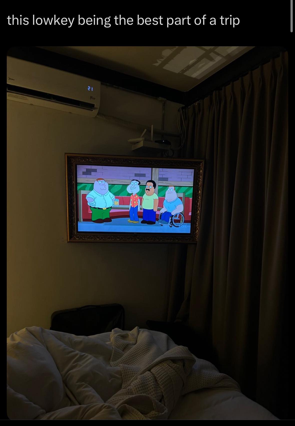 Does anybody find watching Family Guy in a hotel room at night heavenly?