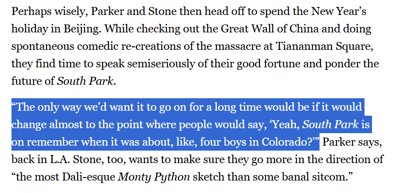 So Matt and Trey said the only way they'd want it to go on would be if people question when it was still about 4 boys in Colorado.So the show's fallen off, right?