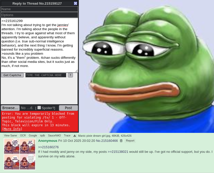 >>215161299I'm not talking about trying to get the jannies' attention. I'm talking about the people in the threads. I try to argue against what most of them apparently believe, and apparently without question (i.e. true sub-normal intelligence behavior), and the next thing I know, I'm getting banned for incredibly superficial reasons.>sounds like a you problemNo, it's a "them" problem. 4chan sucks differently than other social media sites, but it sucks just as much, if not more.And would you look at that... literally while I'm typing my reply to you... probably for this post, where I try to refute that their seething opinion that i'm a janny... if irony were made of strawberries, we'd be making a lot of smoothies right about now.