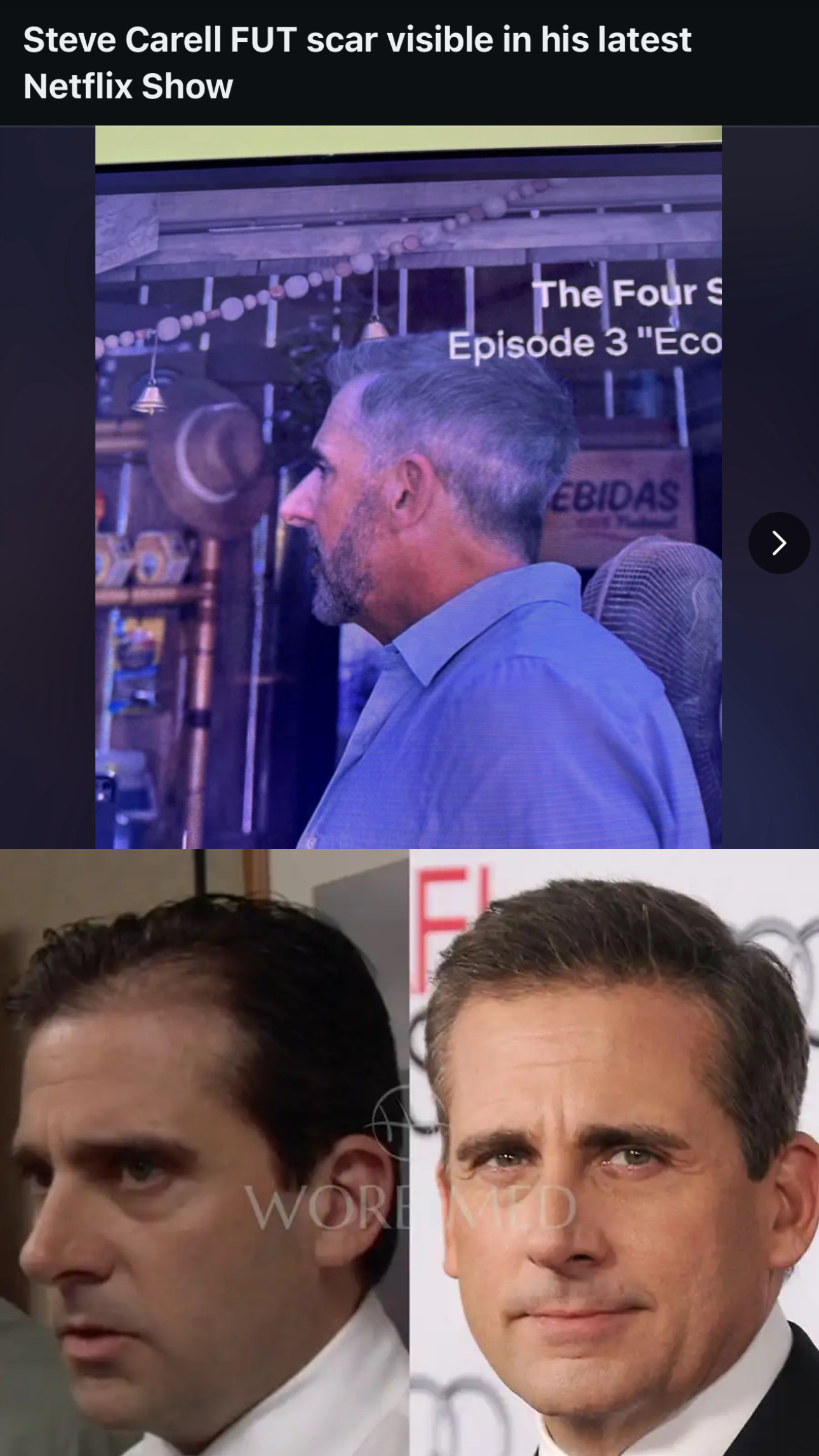 >>215254429That's the same hairline, again. Styled differently in the first scene. But you can see his temples in the Office s1 just like that. Then they changed to the combed over look, so it was obscured. Same hairline.