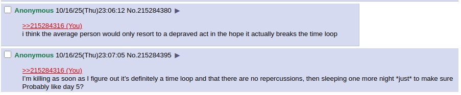 >id be too afraid of the loop ending to do anything truly evil so id be bored shitless too