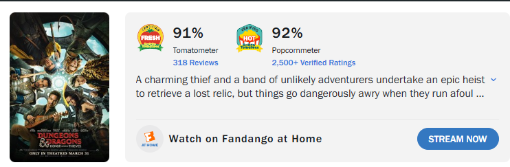 >>215290012First impressions and its release date made it seem like a predestined flop.Also dropped during the peak of fanbase backlash at Wizards of the Coast for shitty proposed changes to D&D stuff.Worst part is that if they had just pushed the movie back like 4-5 months to after BG3's release, it would've probably been one of the most successful film releases of the year.
