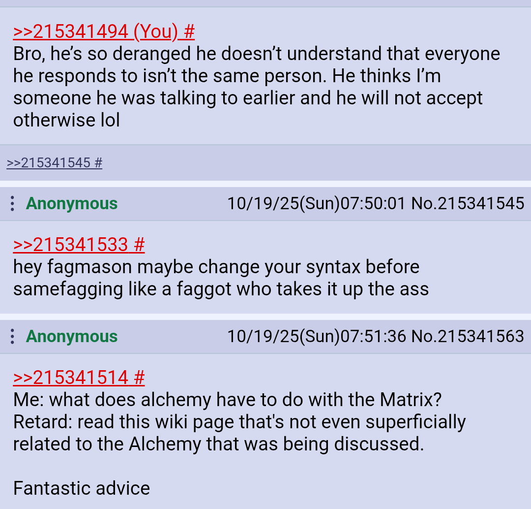 >>215340723>Basic historical knowledgeAh yes the basic historical knowledge of medieval alchemy being somehow related to modern day trans people? I was willing to have a back and forth when I thought you were just a bigot, but now that you’ve outed yourself as a schizo, I have no interest in continuing. I may as well go argue with the local homeless guy. Take care.