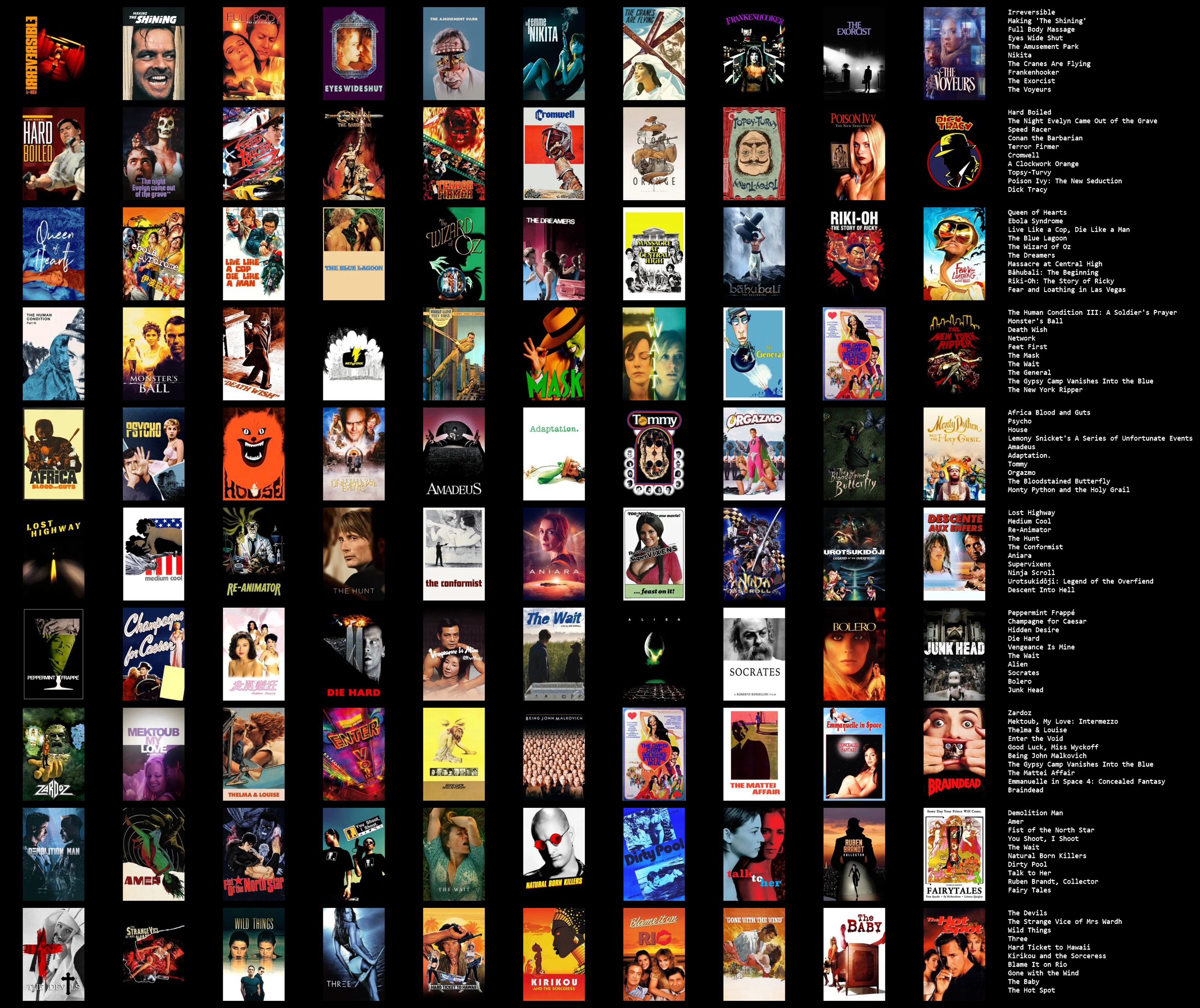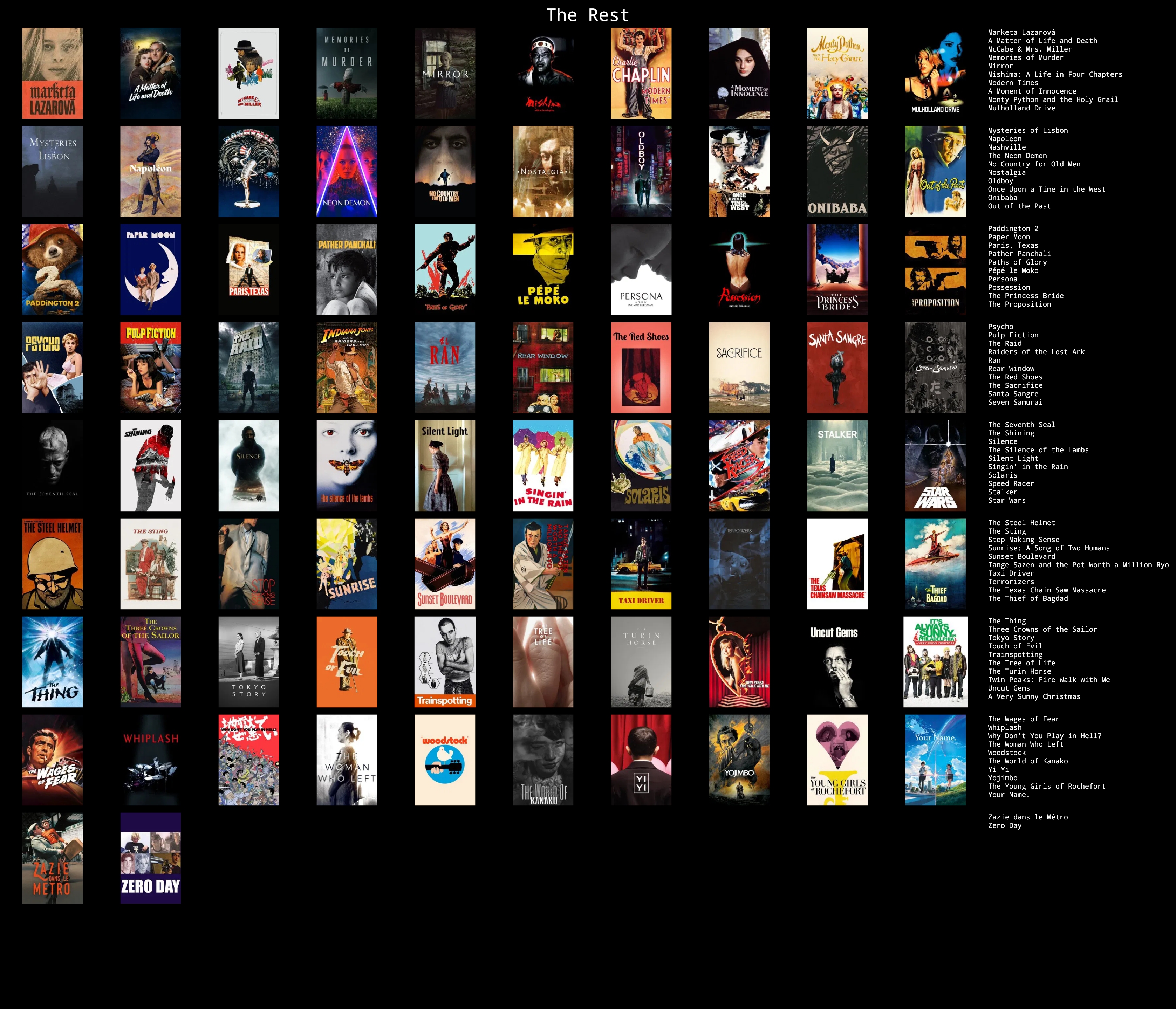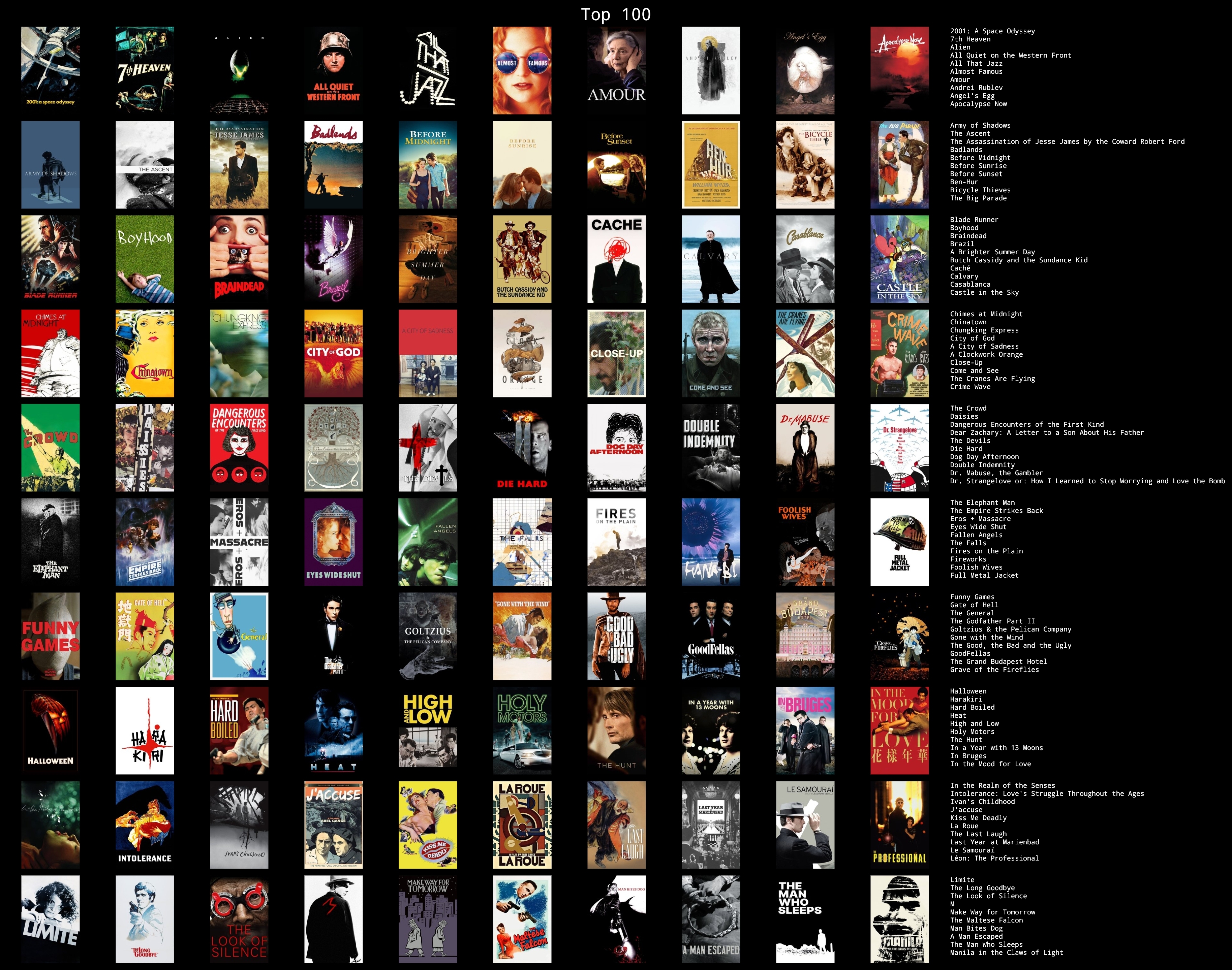 here's just my first 100 5/5 films alphabetically. I was going to whittle the rest down into an actual top 100 (still alphabetically), but I can't be assed after learning that removing a film in topsters doesn't make the rest shift up a space