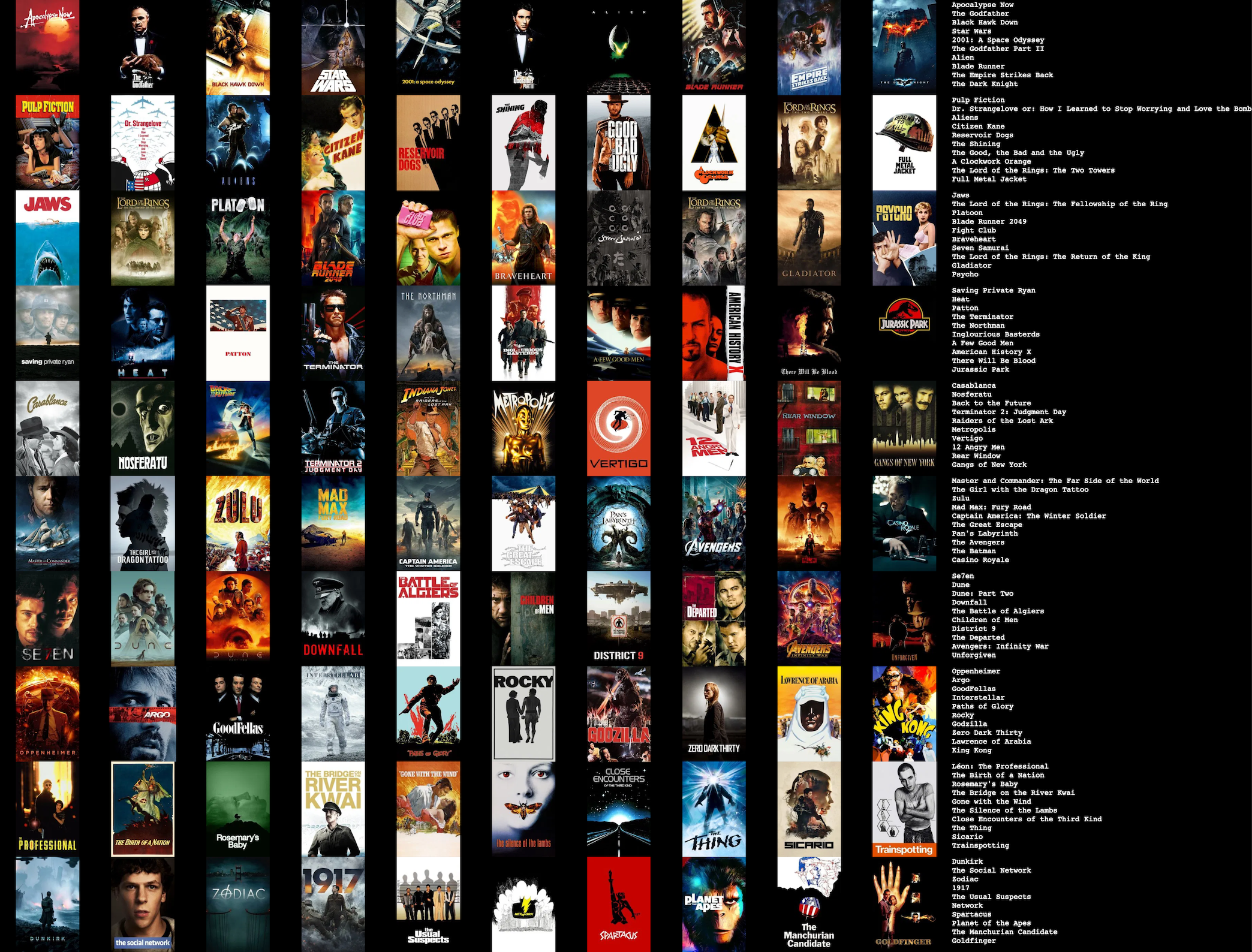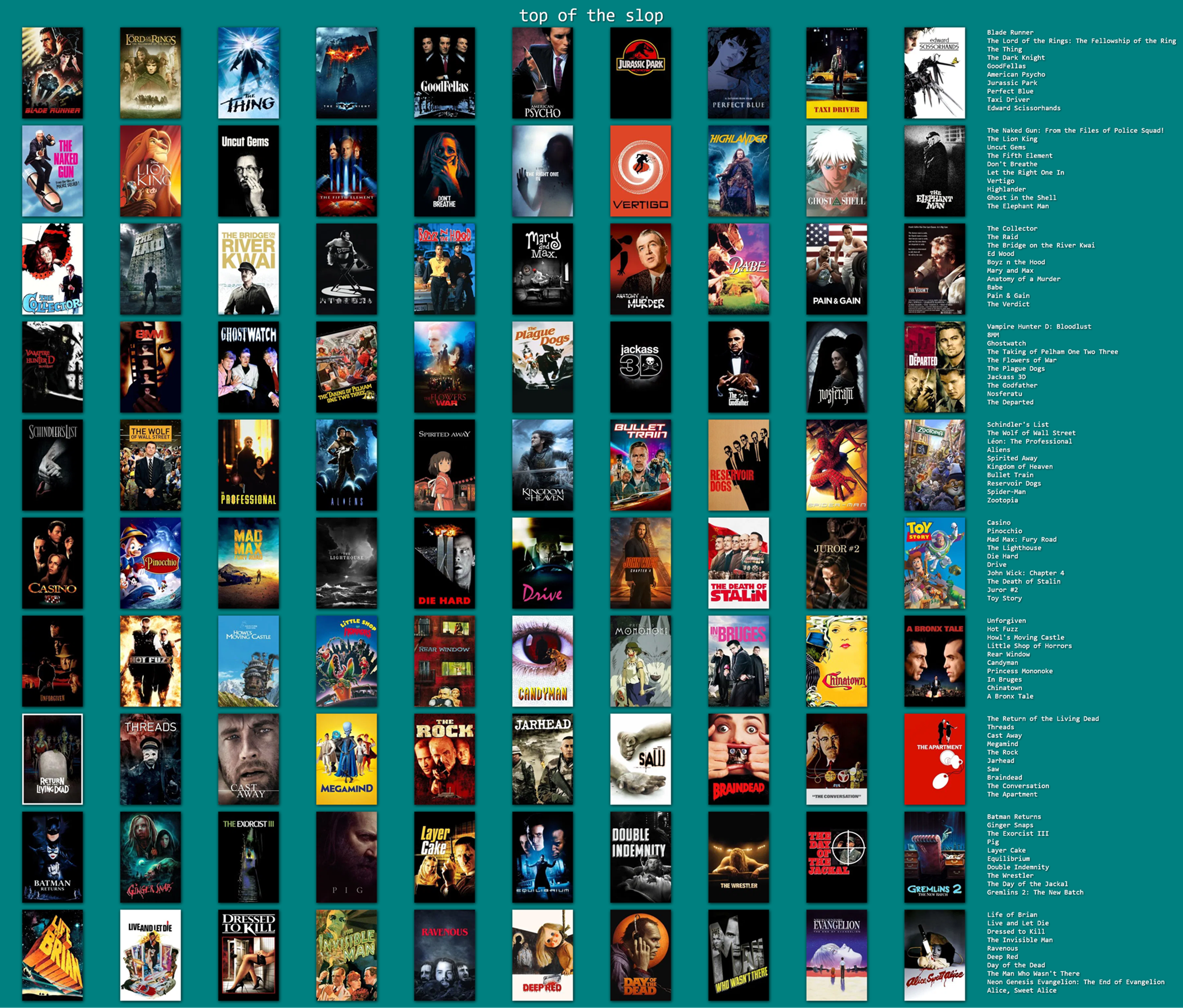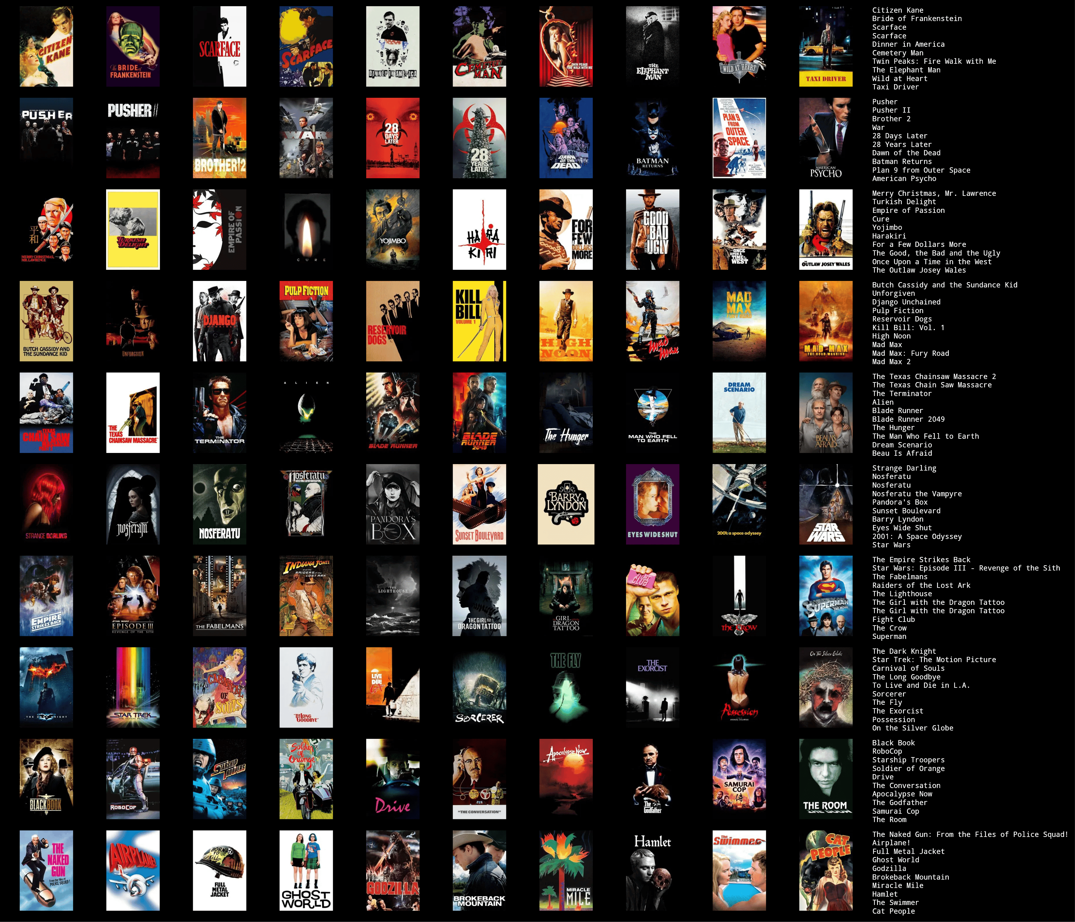 here's just my first 100 5/5 films alphabetically. I was going to whittle the rest down into an actual top 100 (still alphabetically), but I can't be assed after learning that removing a film in topsters doesn't make the rest shift up a space