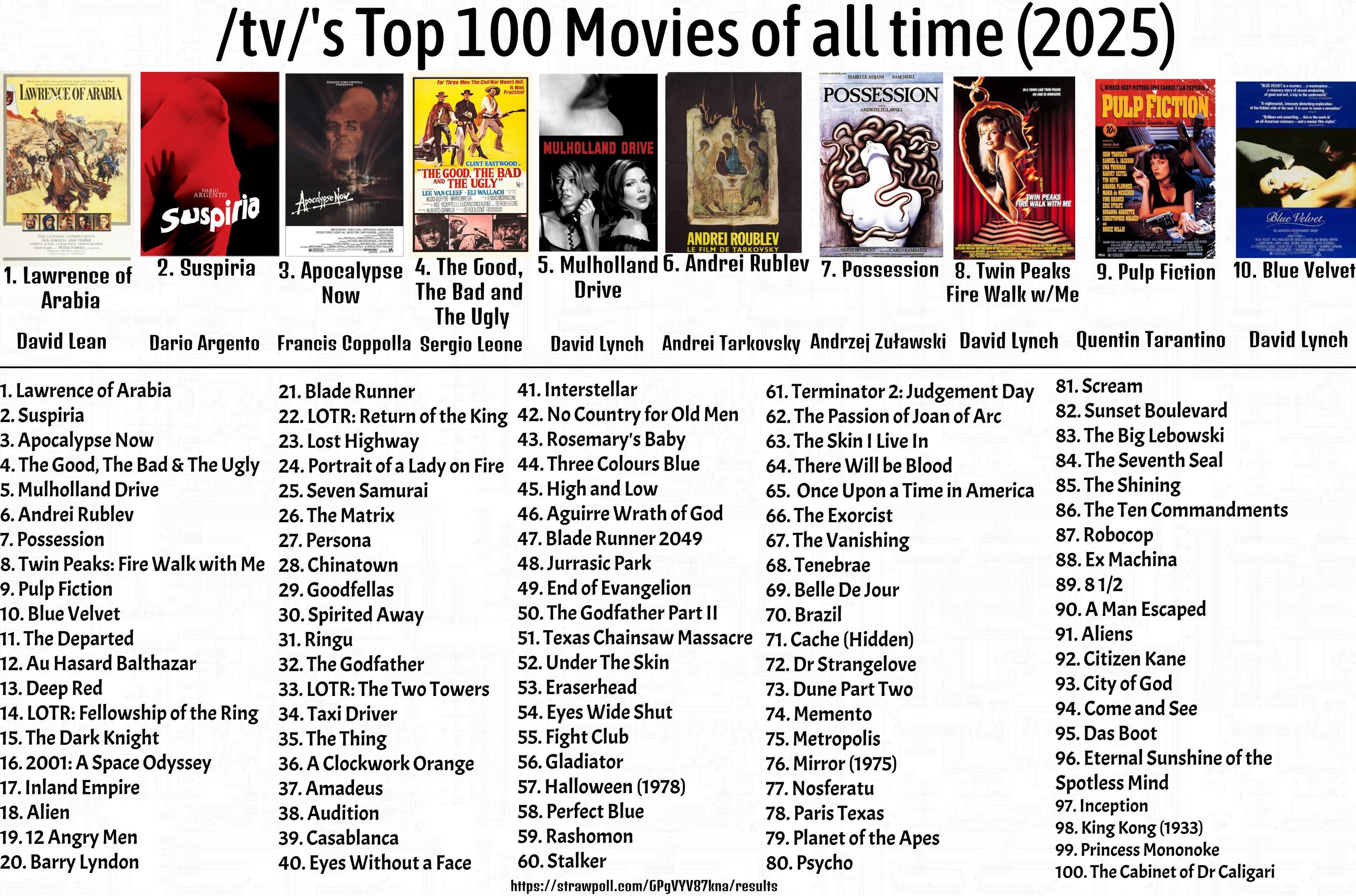 vote for your top 100 films of all timego to https://topsters.org and create a chart with between 1-100 films or, simply write in up to five films in this threadlists do not need to ranked, each film listed counts as 1 pointfor multiple films with the same name, please specify a year or only the original version will be counted