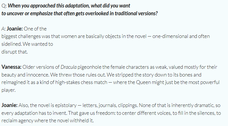 hmm perhaps I will be adventurous and see if there's anything Halloween related in the performing arts around town, oh Dracula>These two exceptional artists have cracked open one of the most enduring gothic legends and reimagined it through a lens of empowerment, sensuality, and female agency.>Traditionally, the women in this story have been cast as victims, as shadows, as silent figures in the orbit of Dracula’s myth. Vanessa and Joanie boldly flip that script, placing the women at the center, giving them voice, complexity, and power. What emerges is a Dracula that feels both timeless and startlingly new — a story about fear, desire, secrets, and survival told in a way that resonates now.well then..