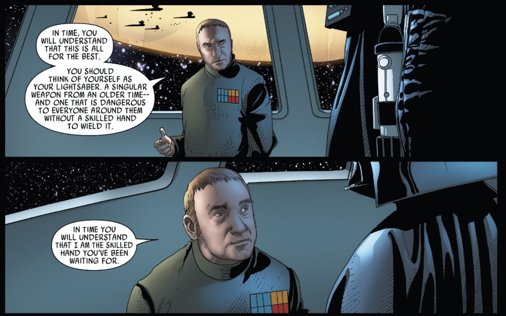 >>215416129In the 2015 Vader comic, it turns out that Tagge (dark lord of the sideburns) was the one other survivor and Palpatine puts him in command for a while, above Vader, because Tagge was the one who advised caution against the Rebel threat. The amusing thing is that Tagge treats Vader like a chump just like Motti did.